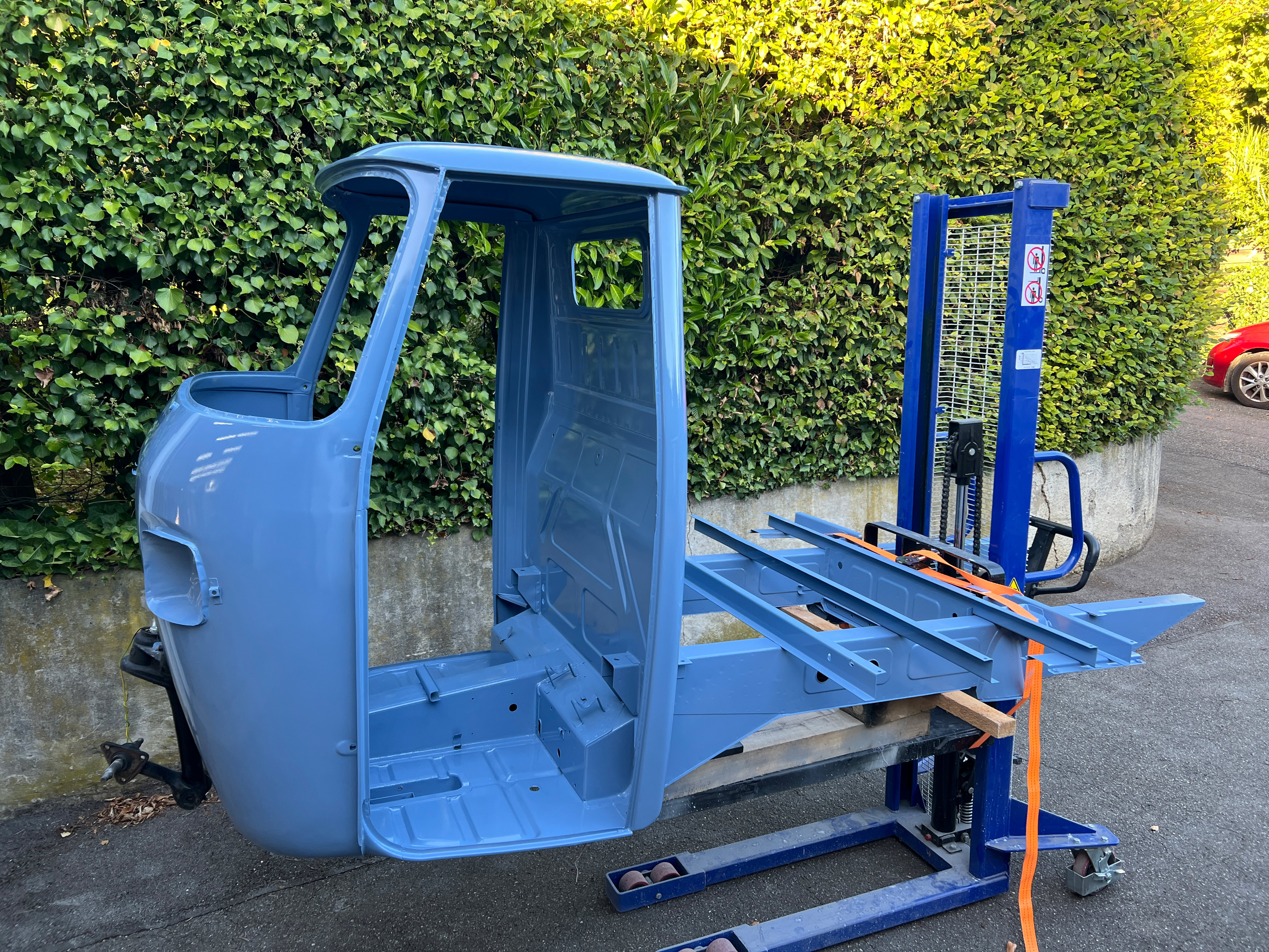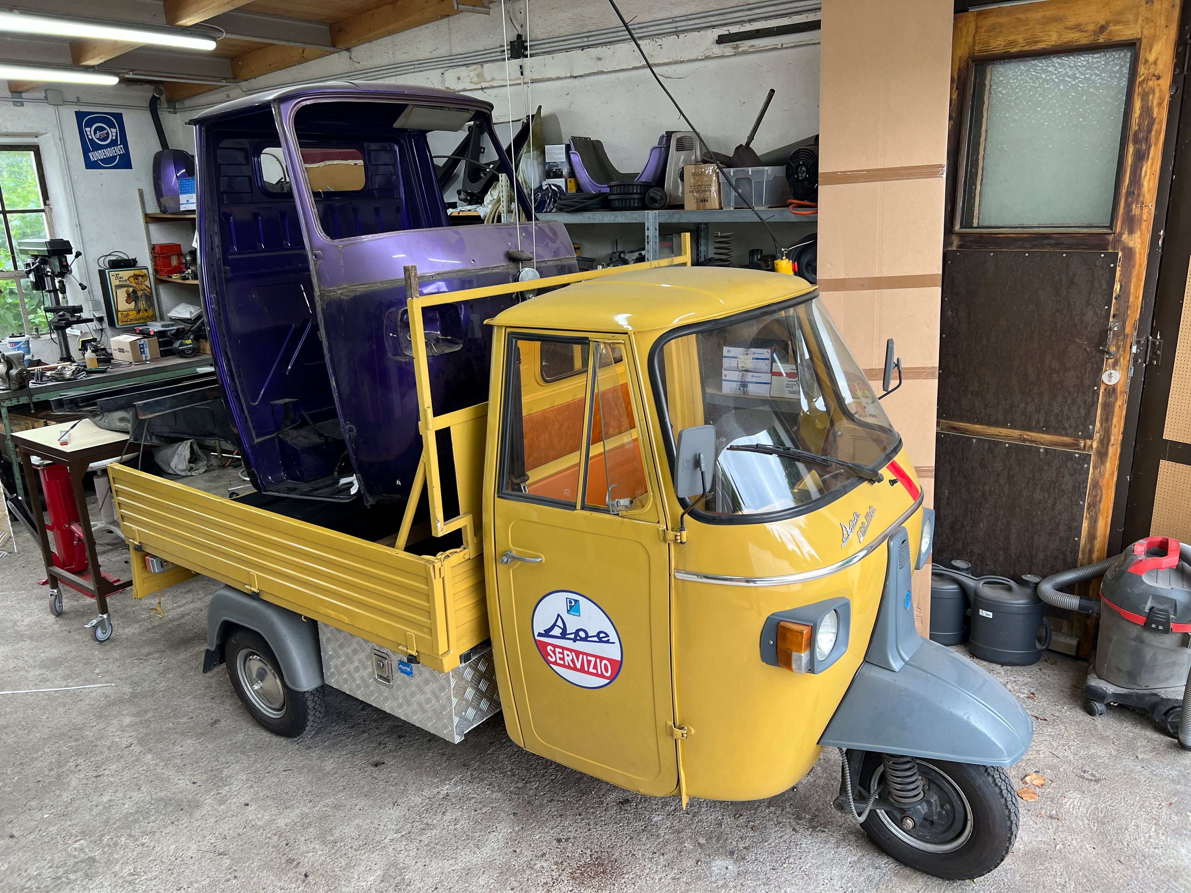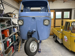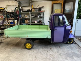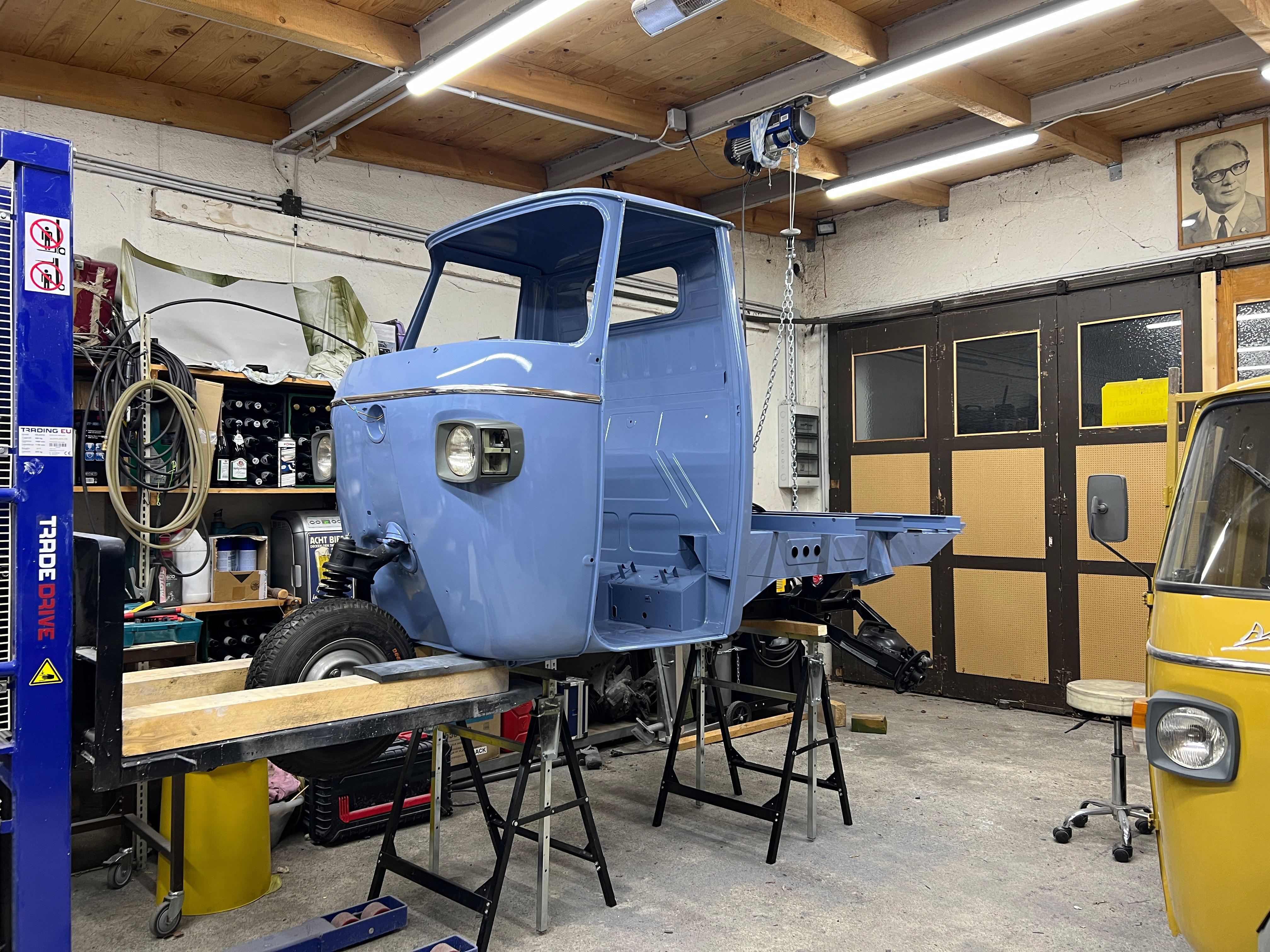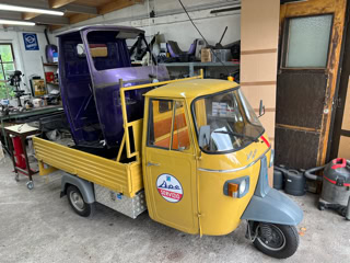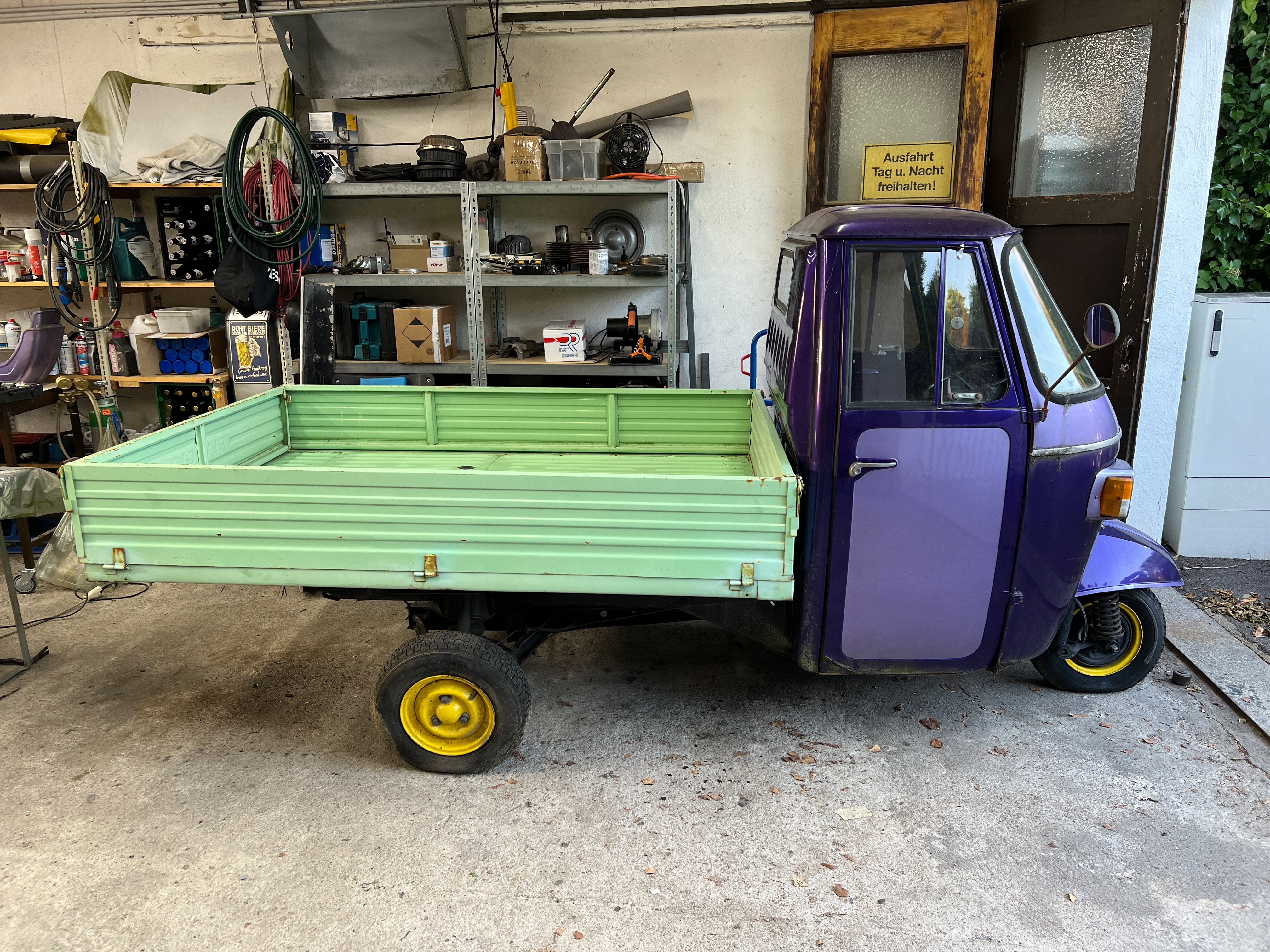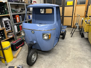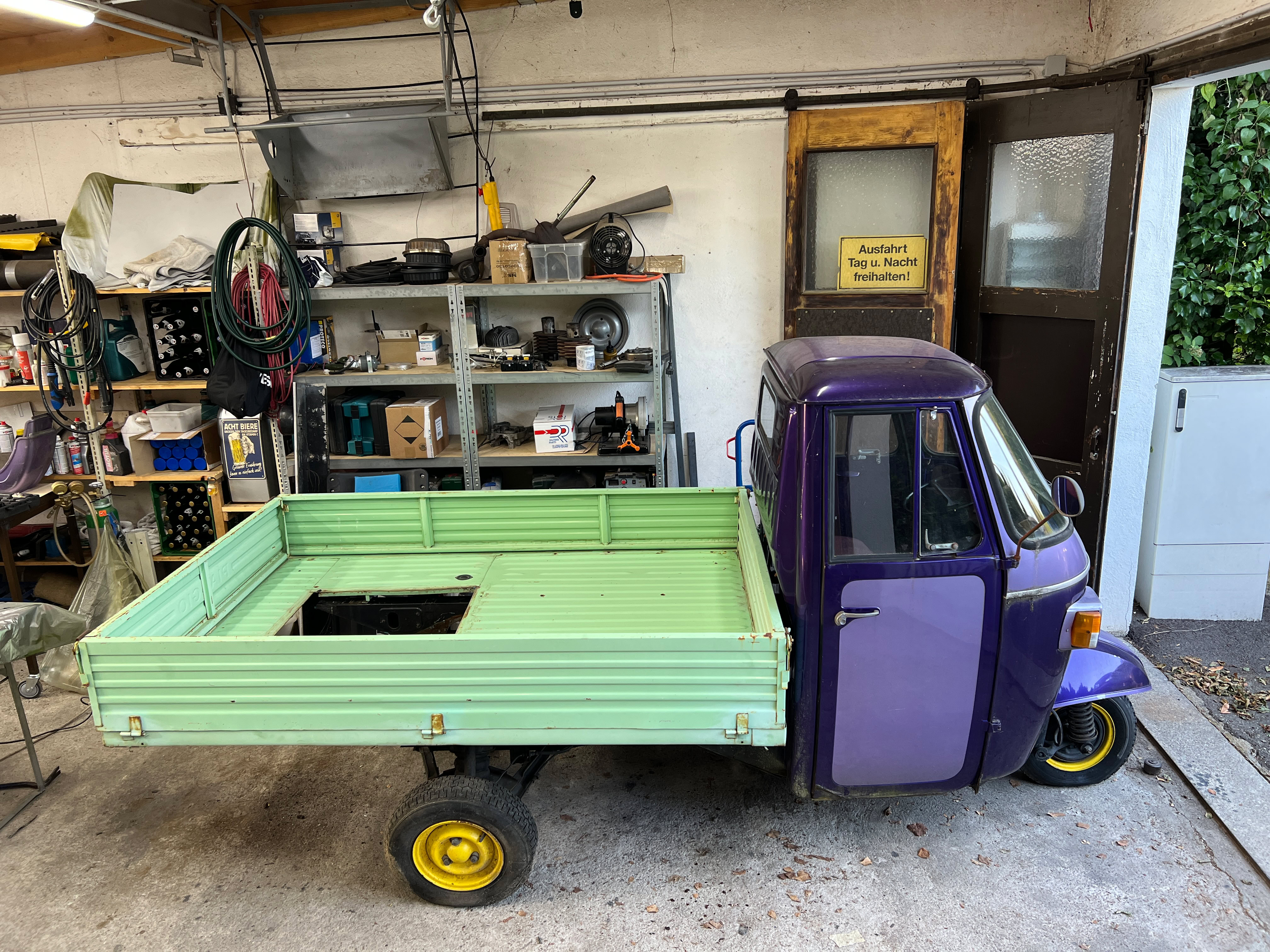 Ape 600 mpv, Baujahr 1972, ursprünglich als Eiswagen umgebaut. Jetzt ohne Pritsche und Motor erworben. Die Ape wurde zerlegt, geschweißt und neu aufgebaut. Ein gebrauchter Motor wurde komplett aufgearbeitet und eingebaut. Die Ape ist inzwischen taubenblau lackiert. Zur Zeit ist die Ladefläche in Arbeit. Es ist eine 2m-Pritsche einer Ape Classic. Deren Motorklappe wurde deshalb entsprechend versetzt und die Unterkonstruktion angepasst.