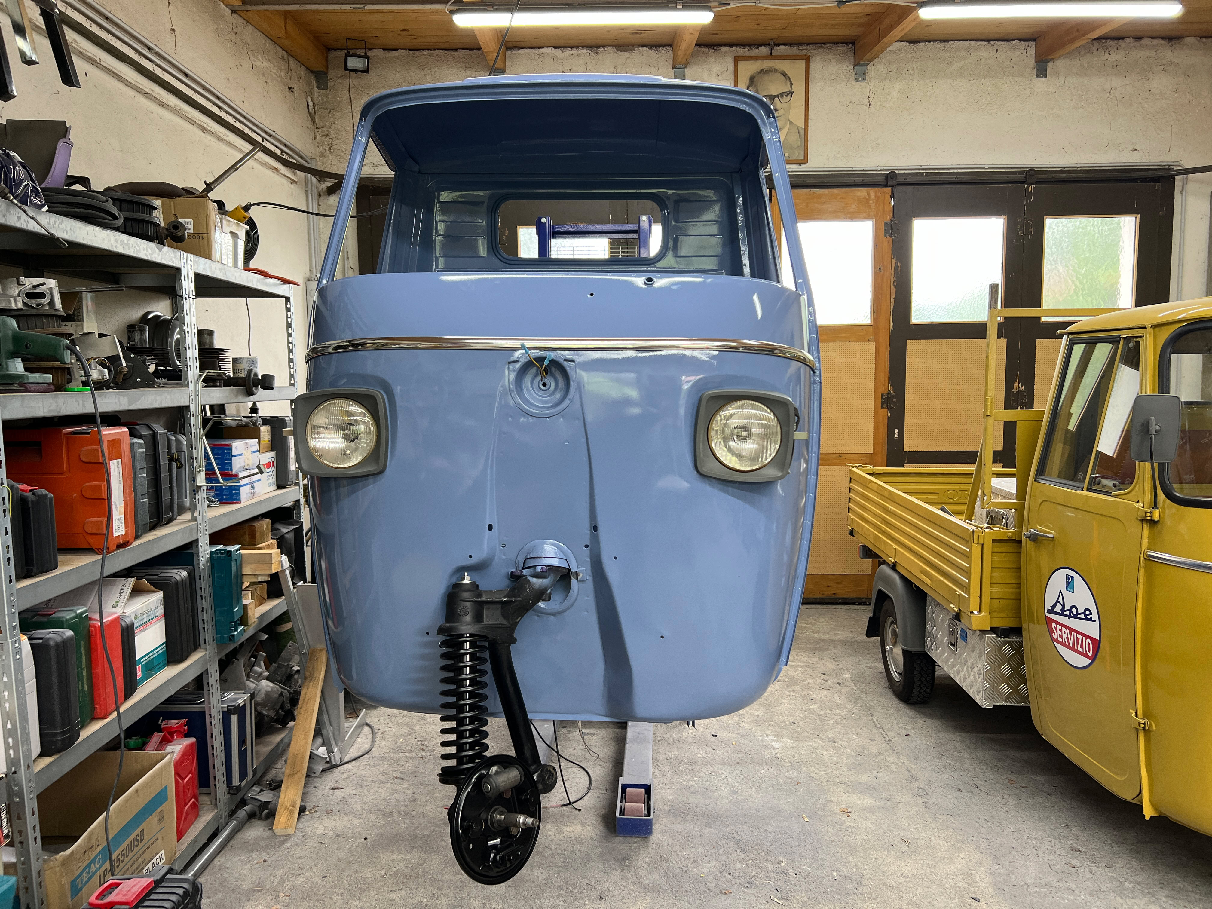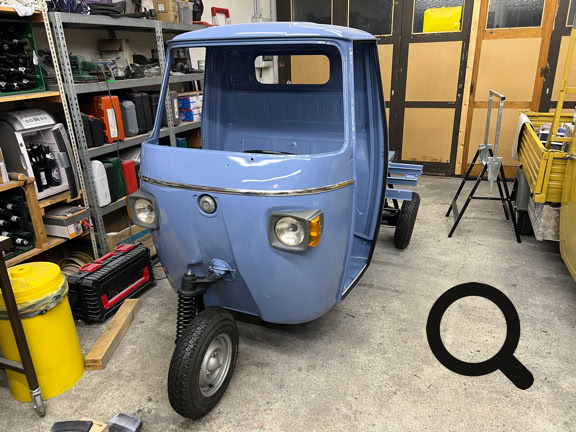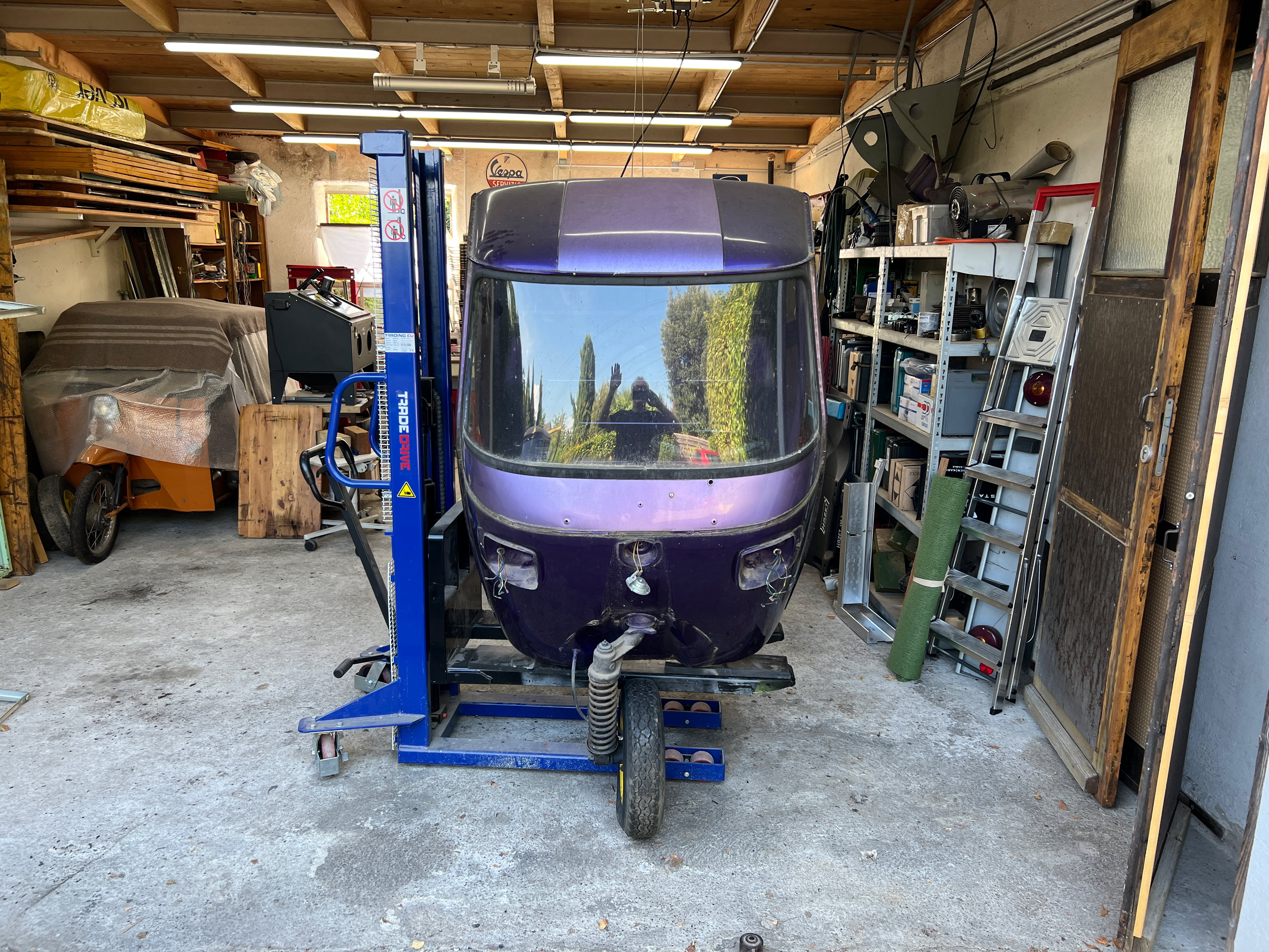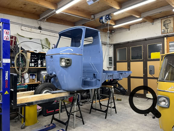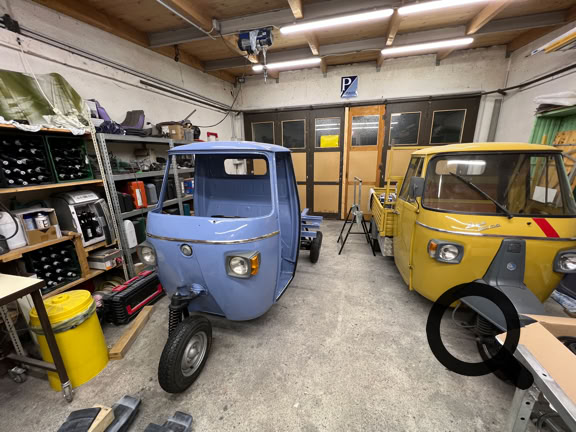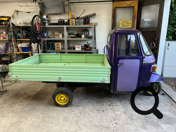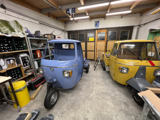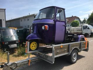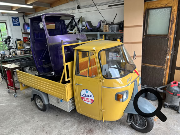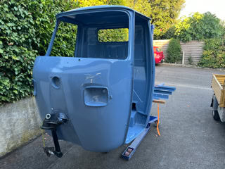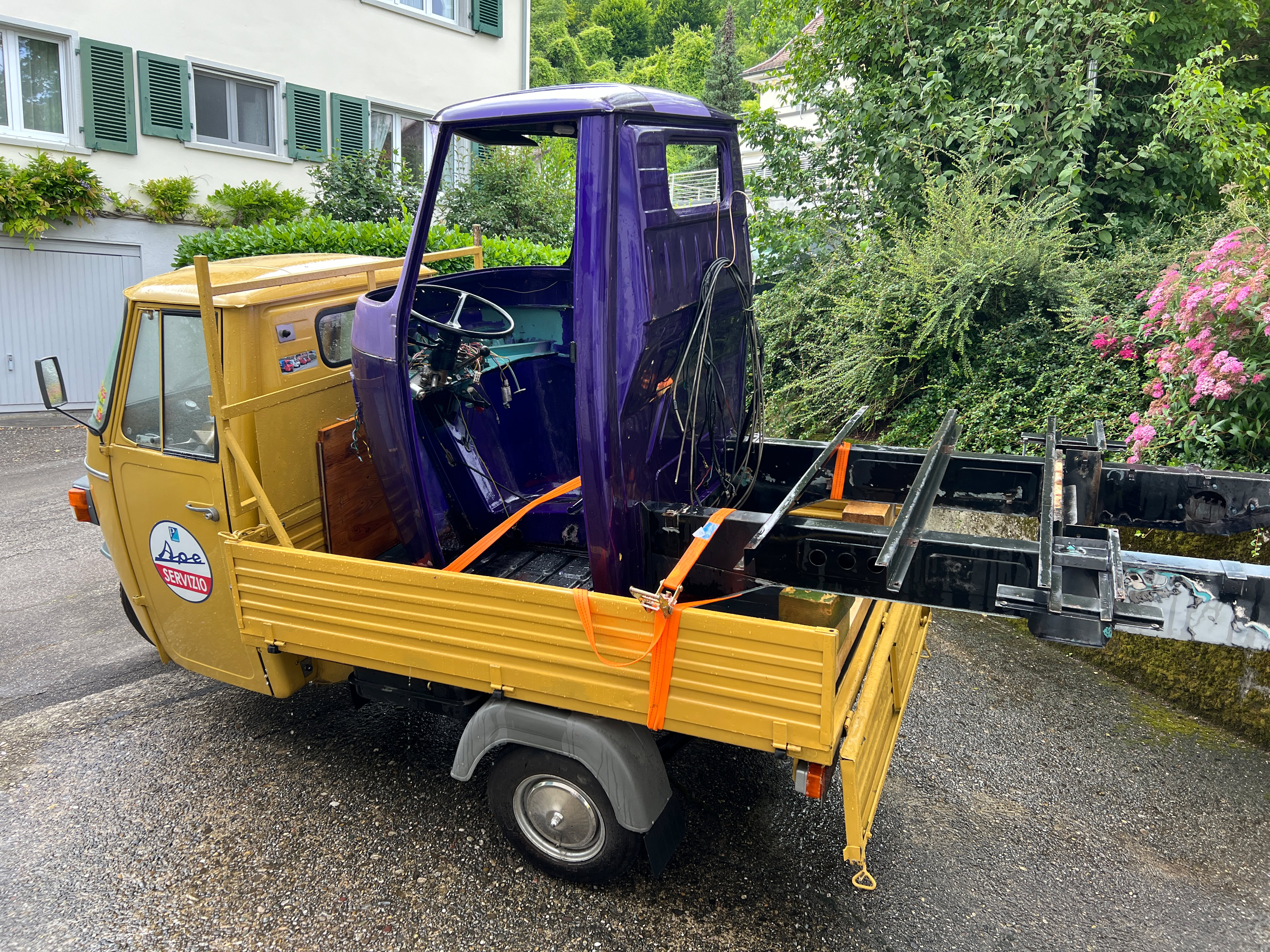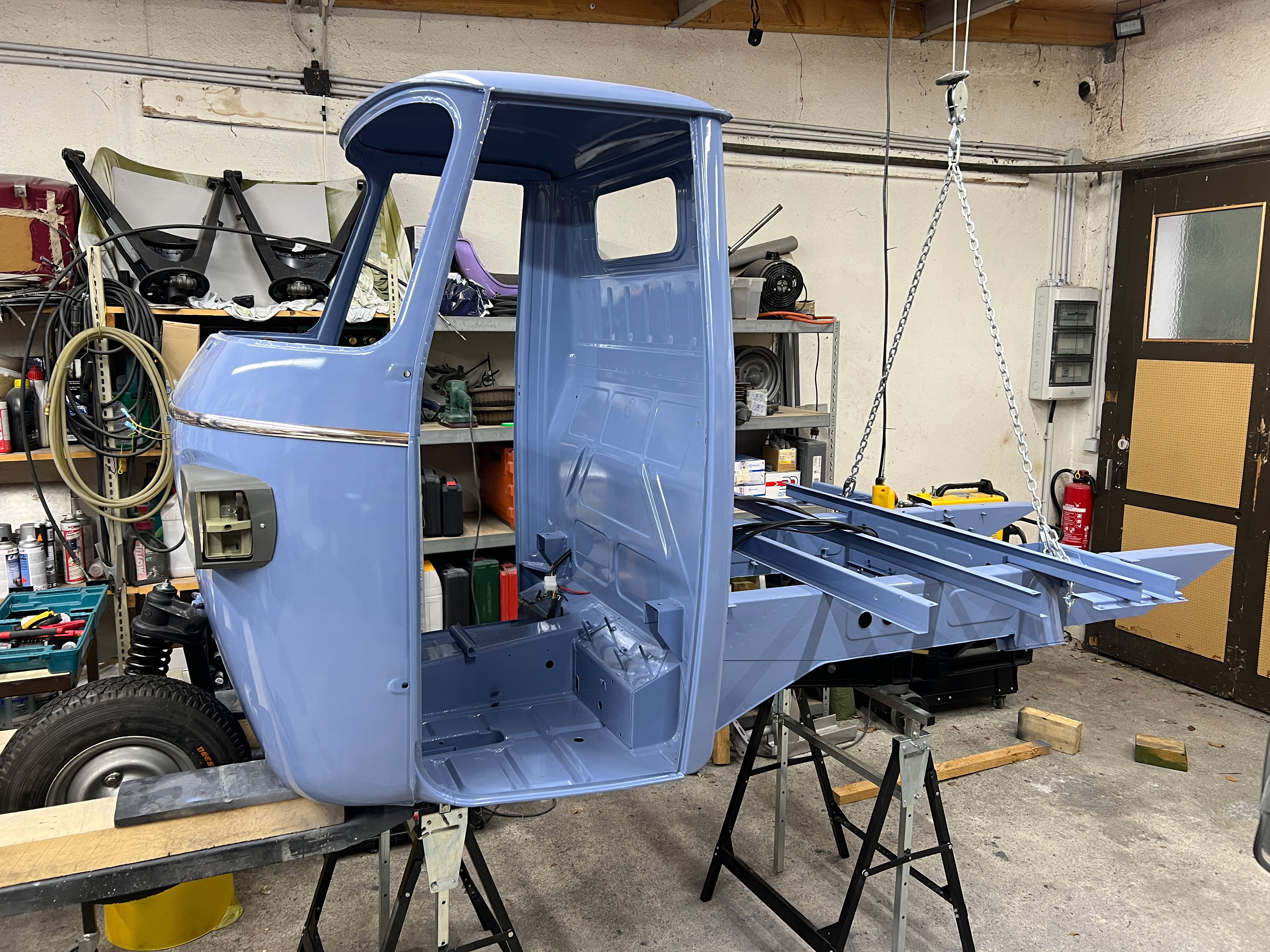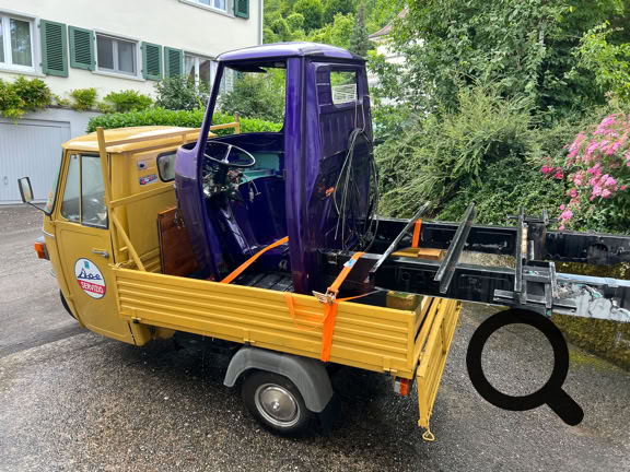 Ape 600 mpv, Baujahr 1972, ursprünglich als Eiswagen umgebaut. Jetzt ohne Pritsche und Motor erworben. Die Ape wurde zerlegt, geschweißt und neu aufgebaut. Ein gebrauchter Motor wurde komplett aufgearbeitet und eingebaut. Die Ape ist inzwischen taubenblau lackiert. Zur Zeit ist die Ladefläche in Arbeit. Es ist eine 2m-Pritsche einer Ape Classic. Deren Motorklappe wurde deshalb entsprechend versetzt und die Unterkonstruktion angepasst.