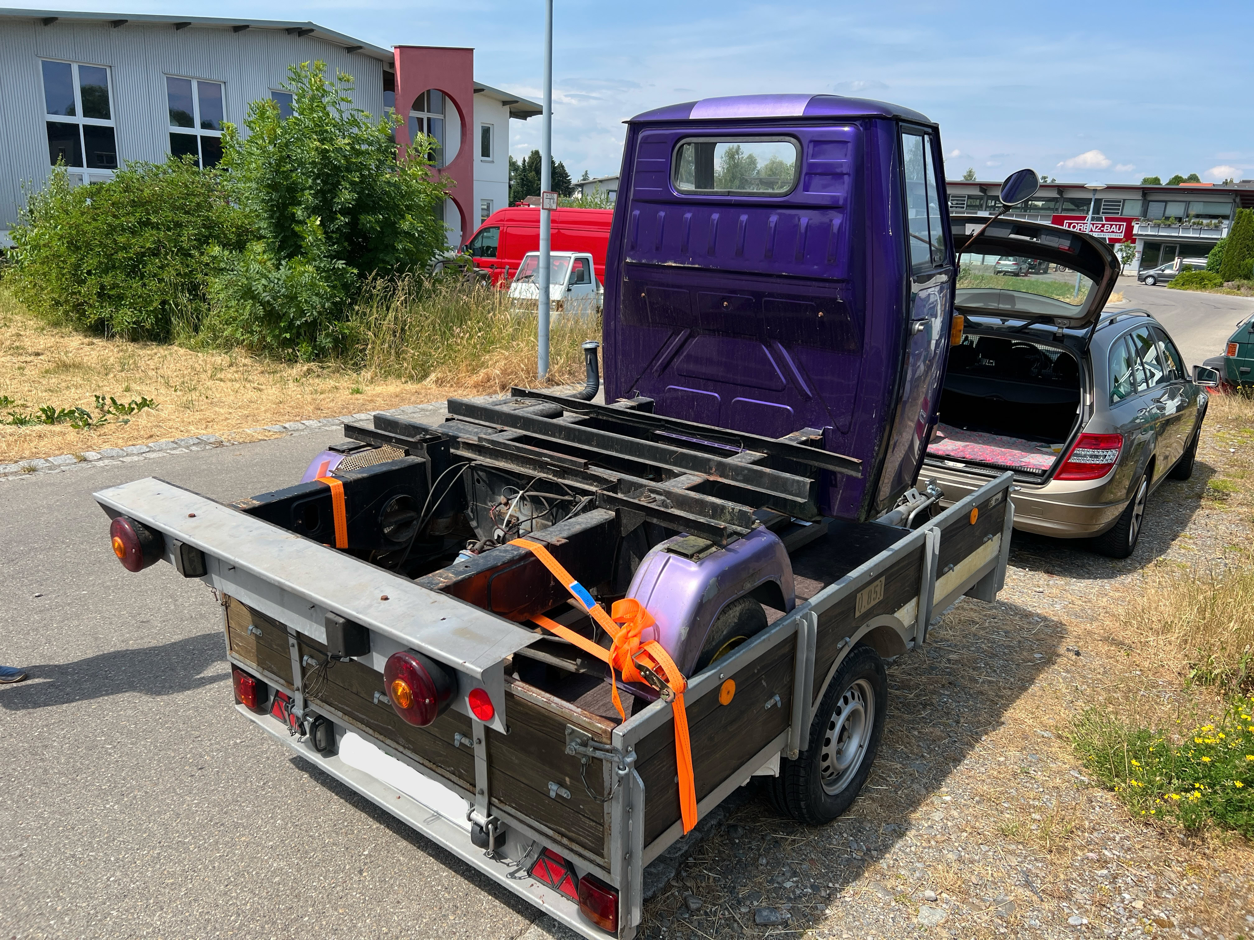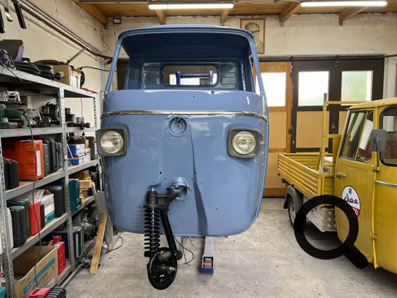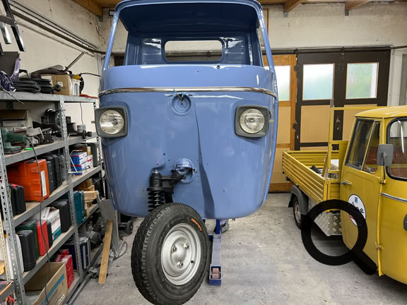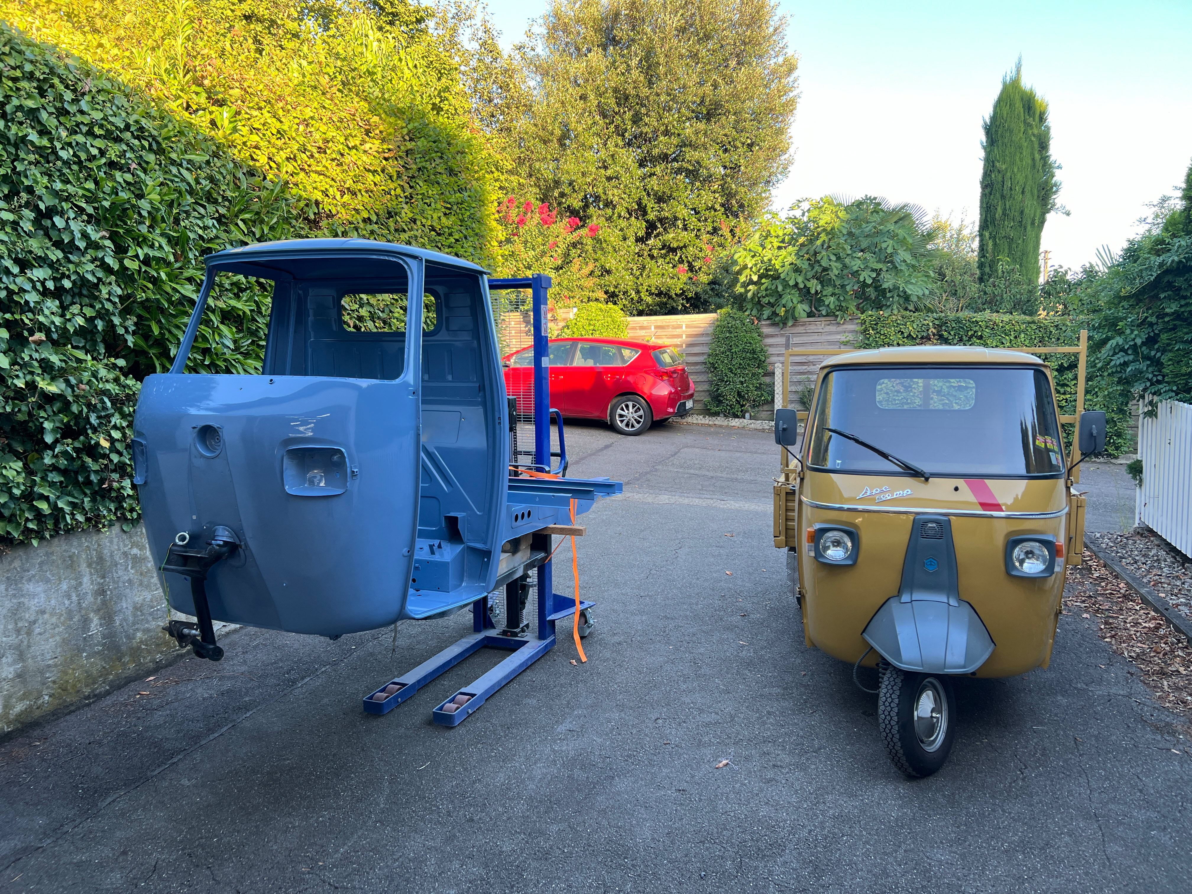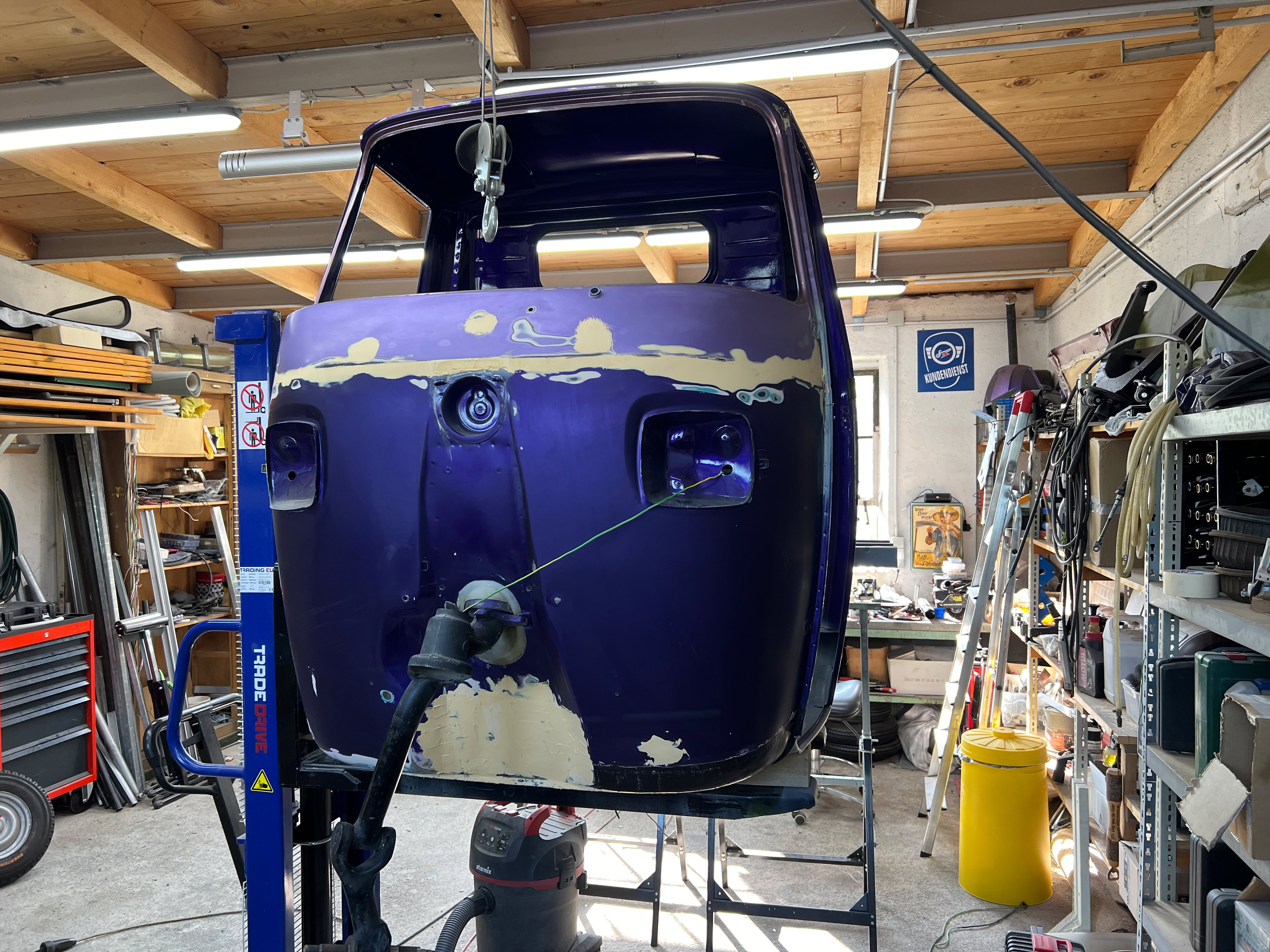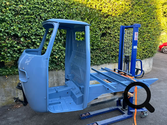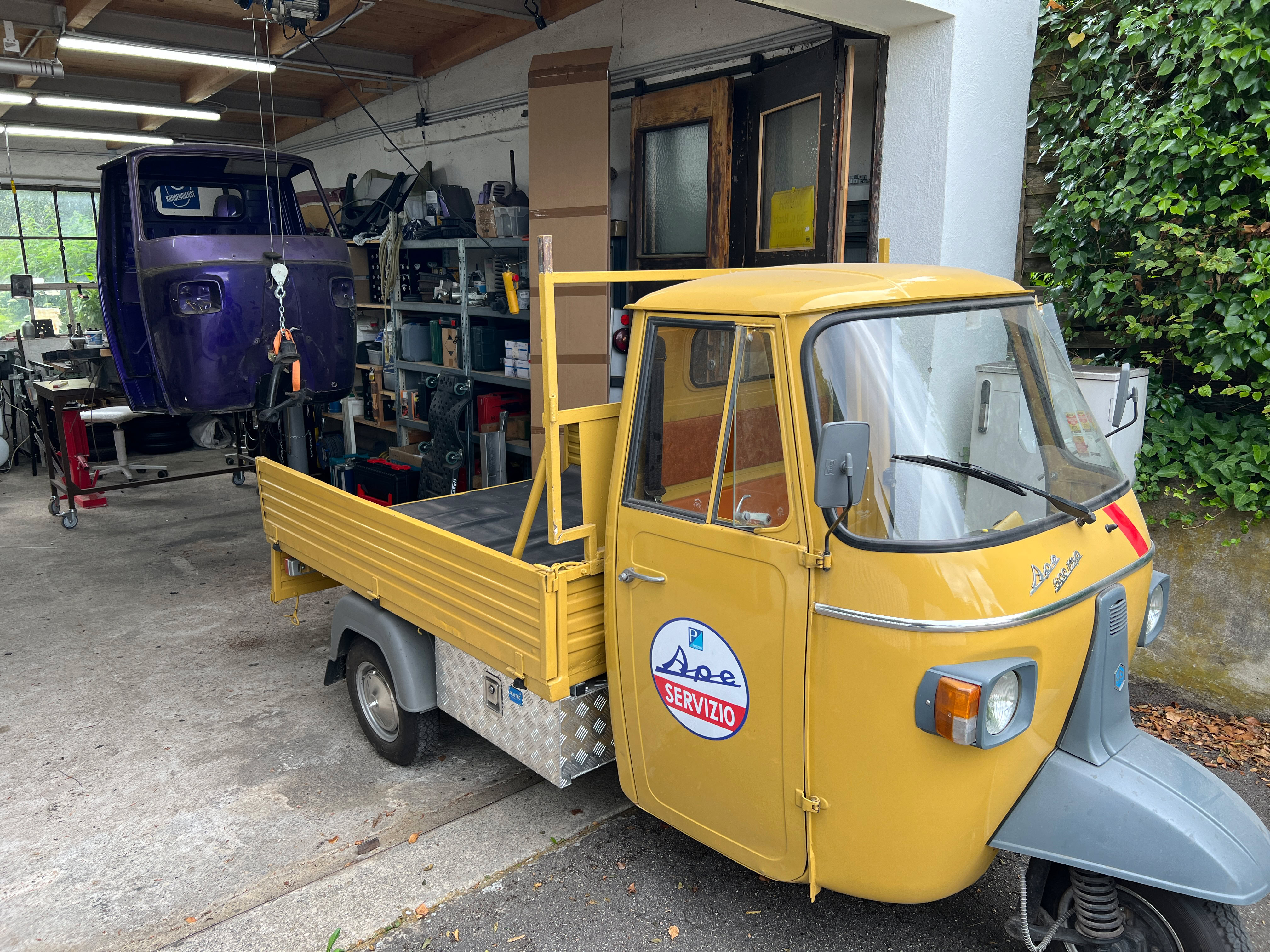Ape 600 mpv, Baujahr 1972, ursprünglich als Eiswagen umgebaut. Jetzt ohne Pritsche und Motor erworben. Die Ape wurde zerlegt, geschweißt und neu aufgebaut. Ein gebrauchter Motor wurde komplett aufgearbeitet und eingebaut. Die Ape ist inzwischen taubenblau lackiert. Zur Zeit ist die Ladefläche in Arbeit. Es ist eine 2m-Pritsche einer Ape Classic. Deren Motorklappe wurde deshalb entsprechend versetzt und die Unterkonstruktion angepasst.