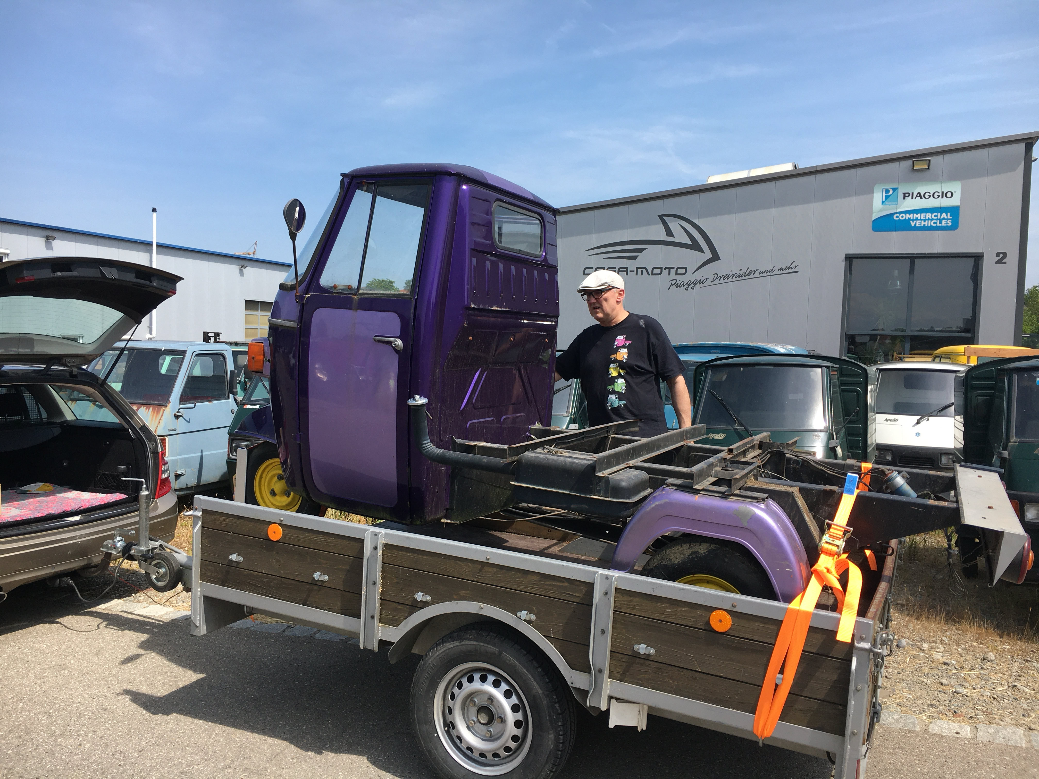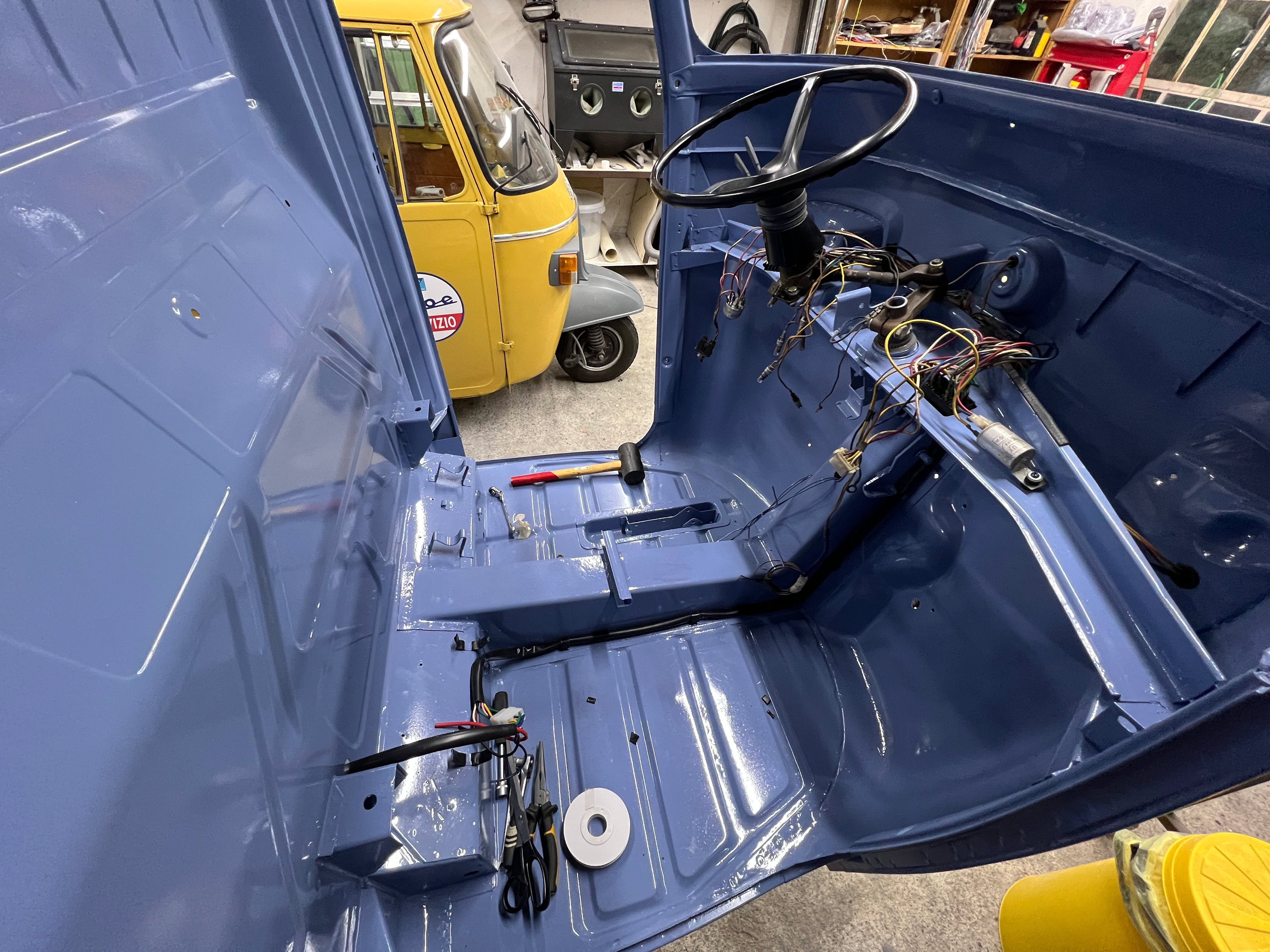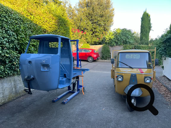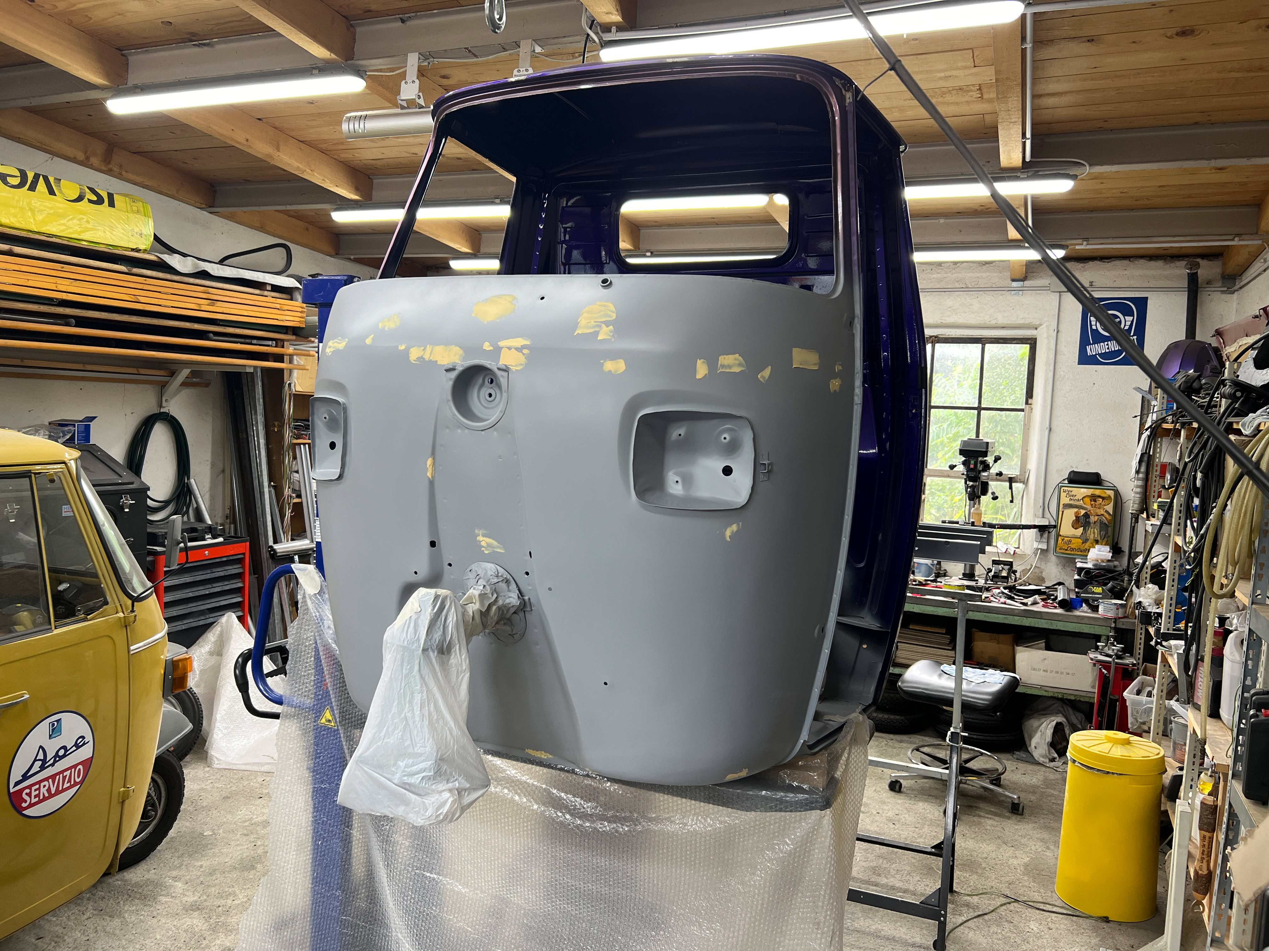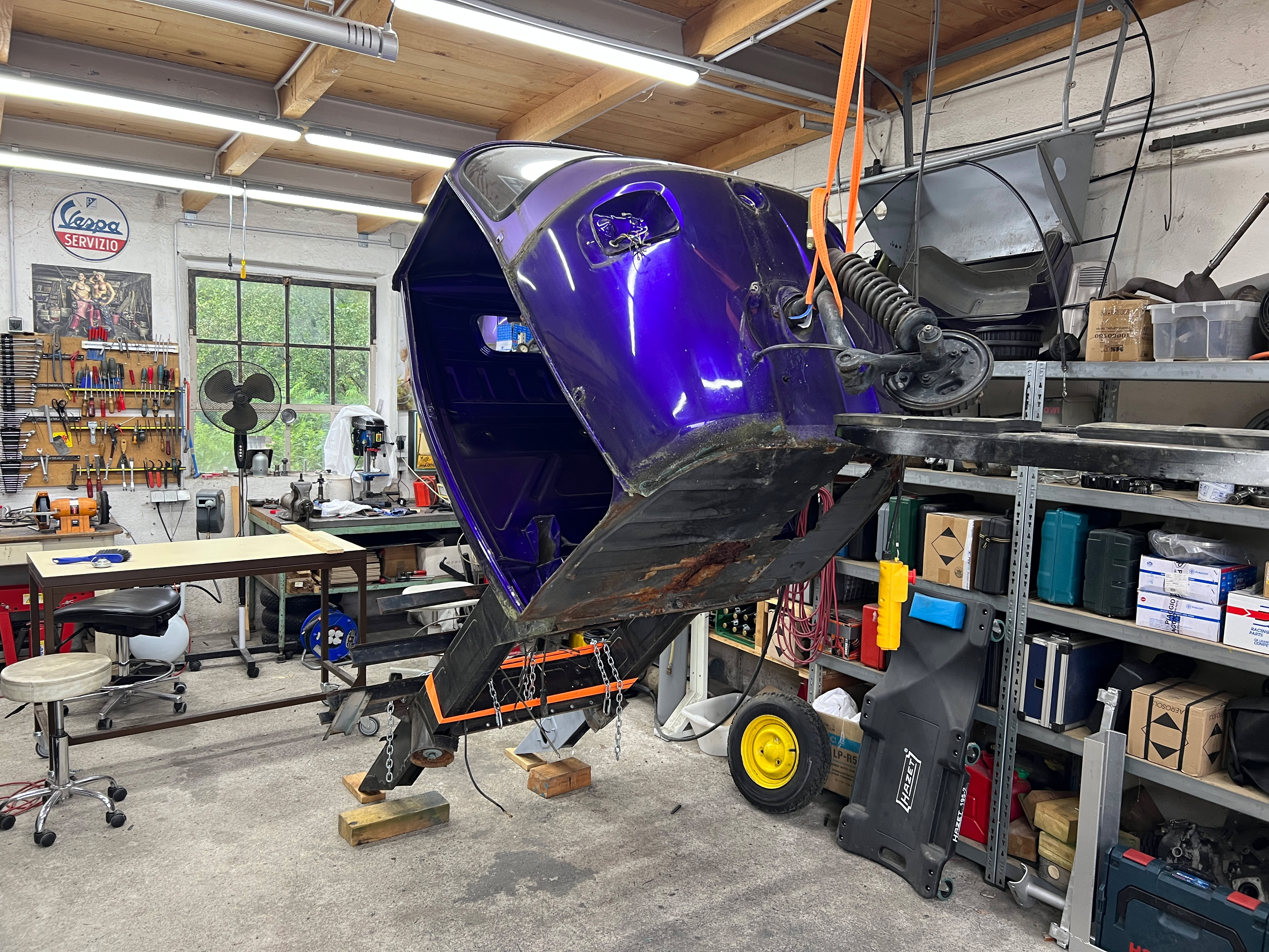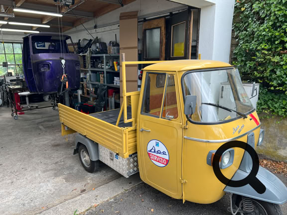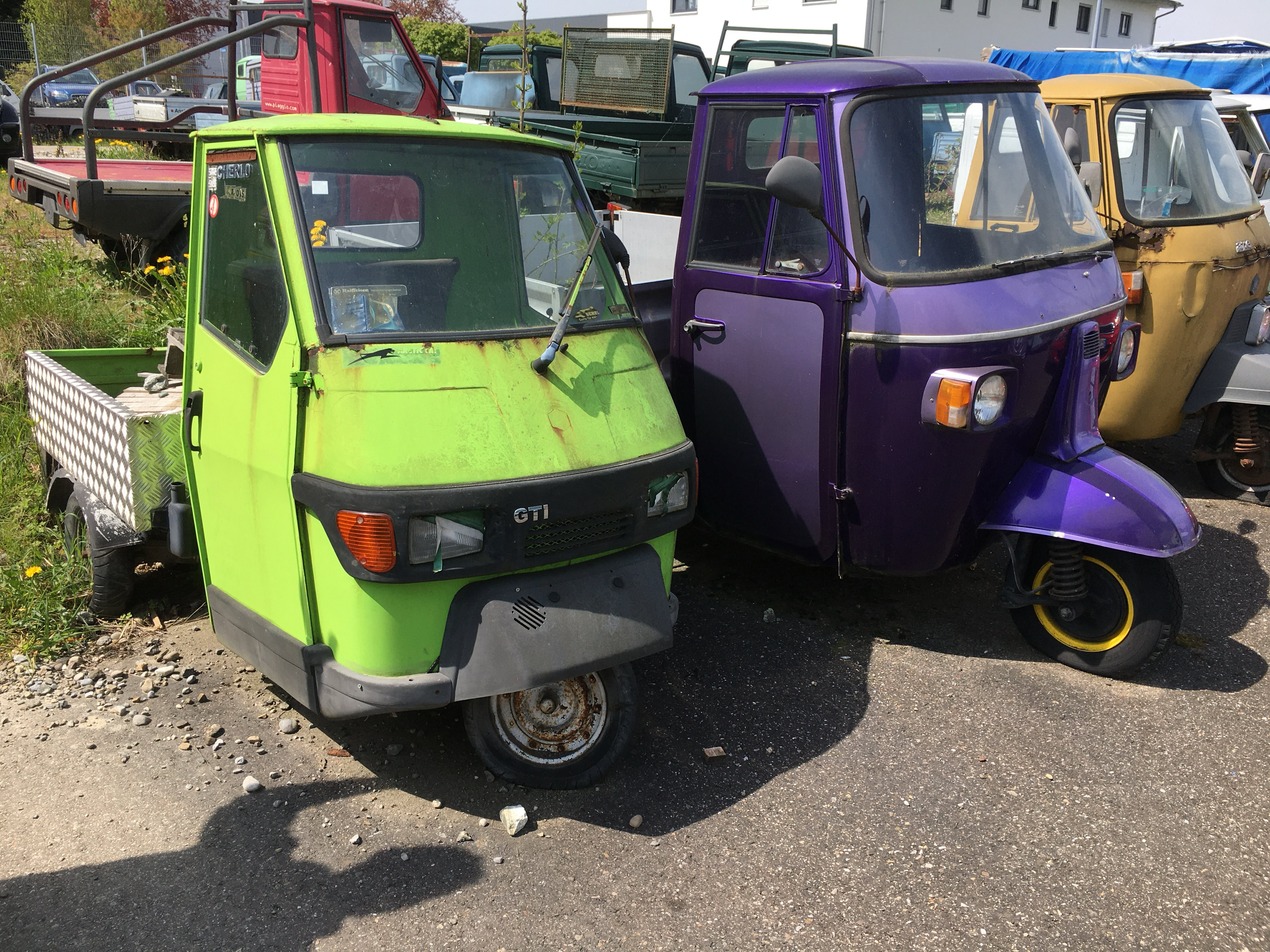 Ape 600 mpv, Baujahr 1972, ursprünglich als Eiswagen umgebaut. Jetzt ohne Pritsche und Motor erworben. Die Ape wurde zerlegt, geschweißt und neu aufgebaut. Ein gebrauchter Motor wurde komplett aufgearbeitet und eingebaut. Die Ape ist inzwischen taubenblau lackiert. Zur Zeit ist die Ladefläche in Arbeit. Es ist eine 2m-Pritsche einer Ape Classic. Deren Motorklappe wurde deshalb entsprechend versetzt und die Unterkonstruktion angepasst.