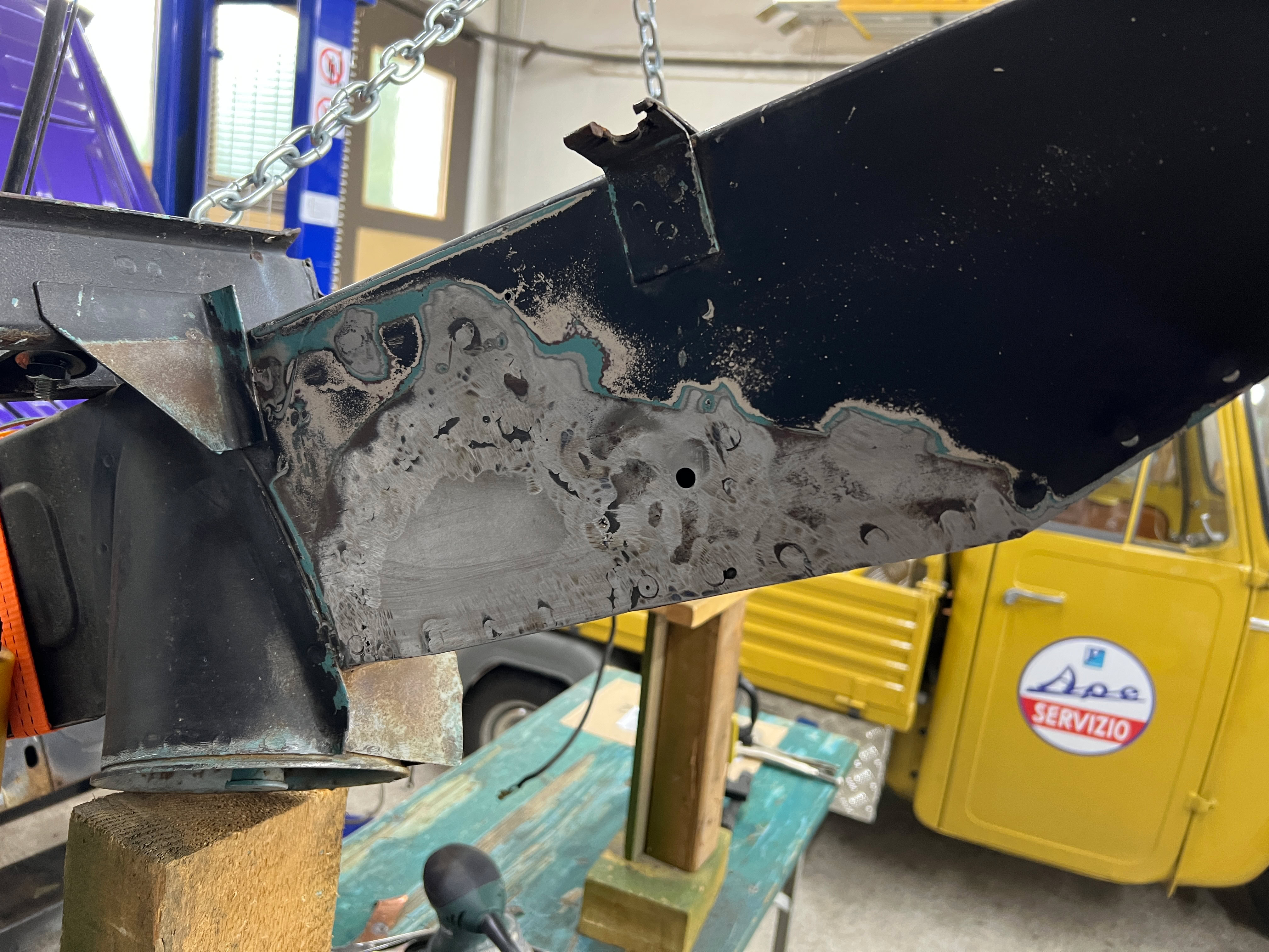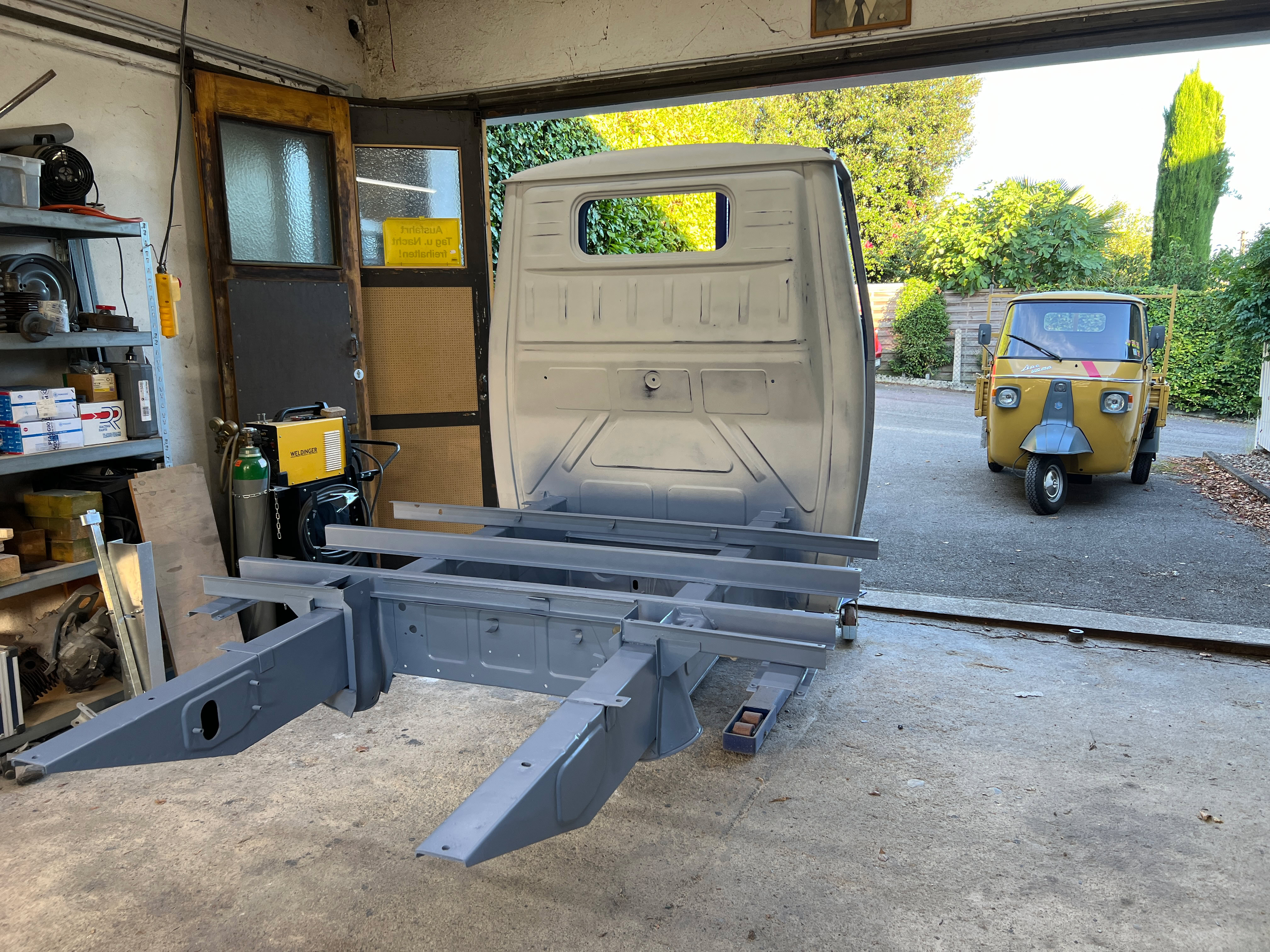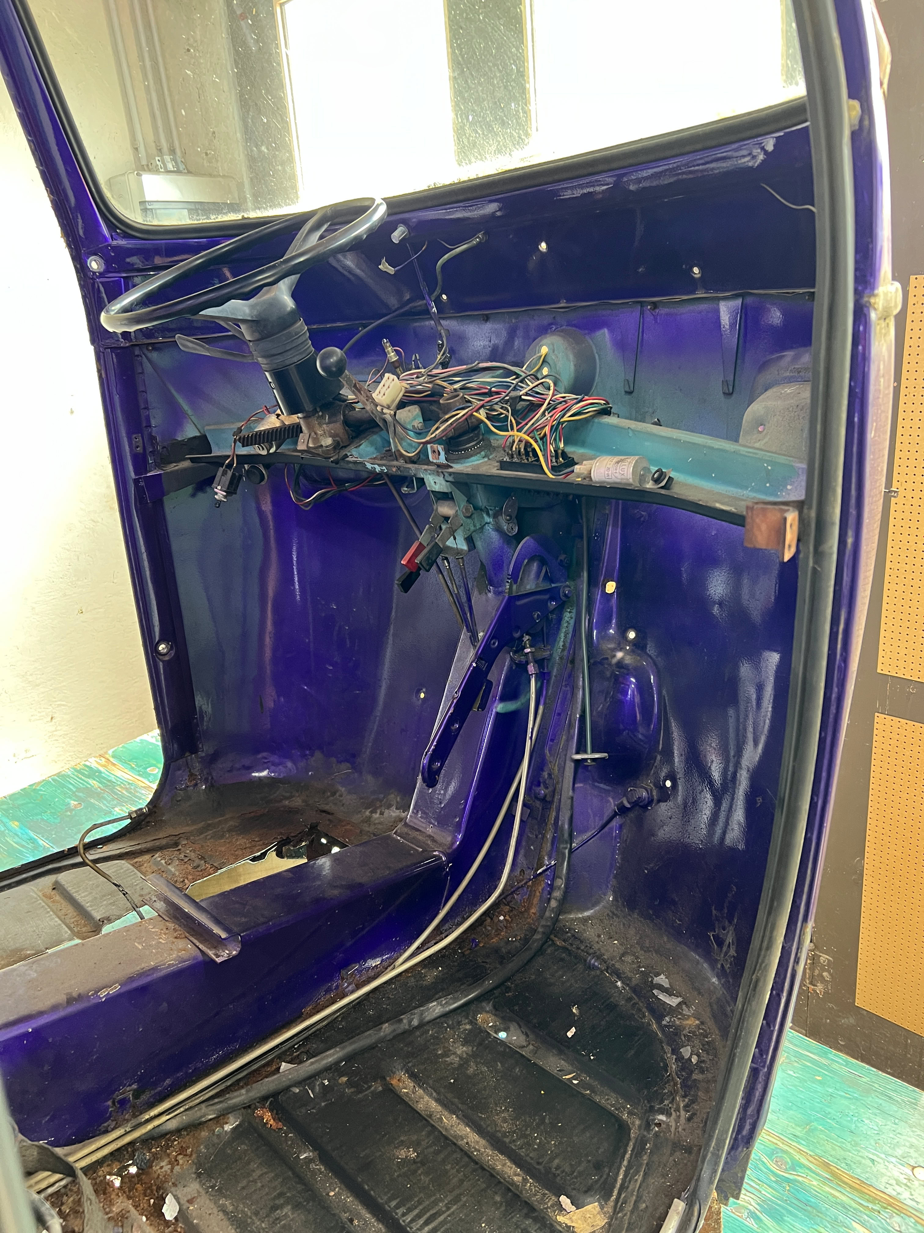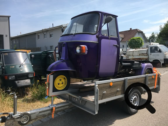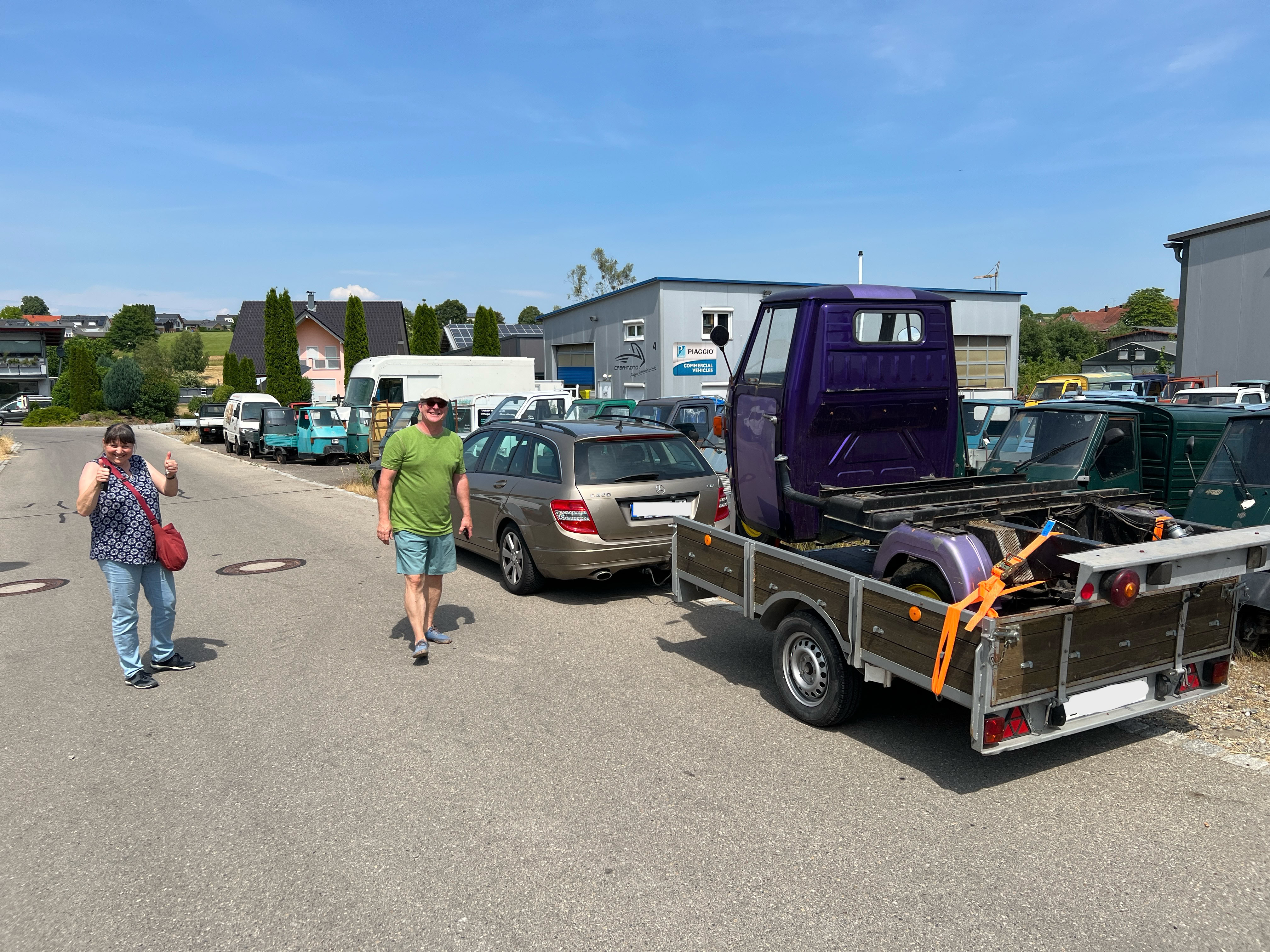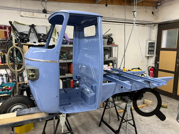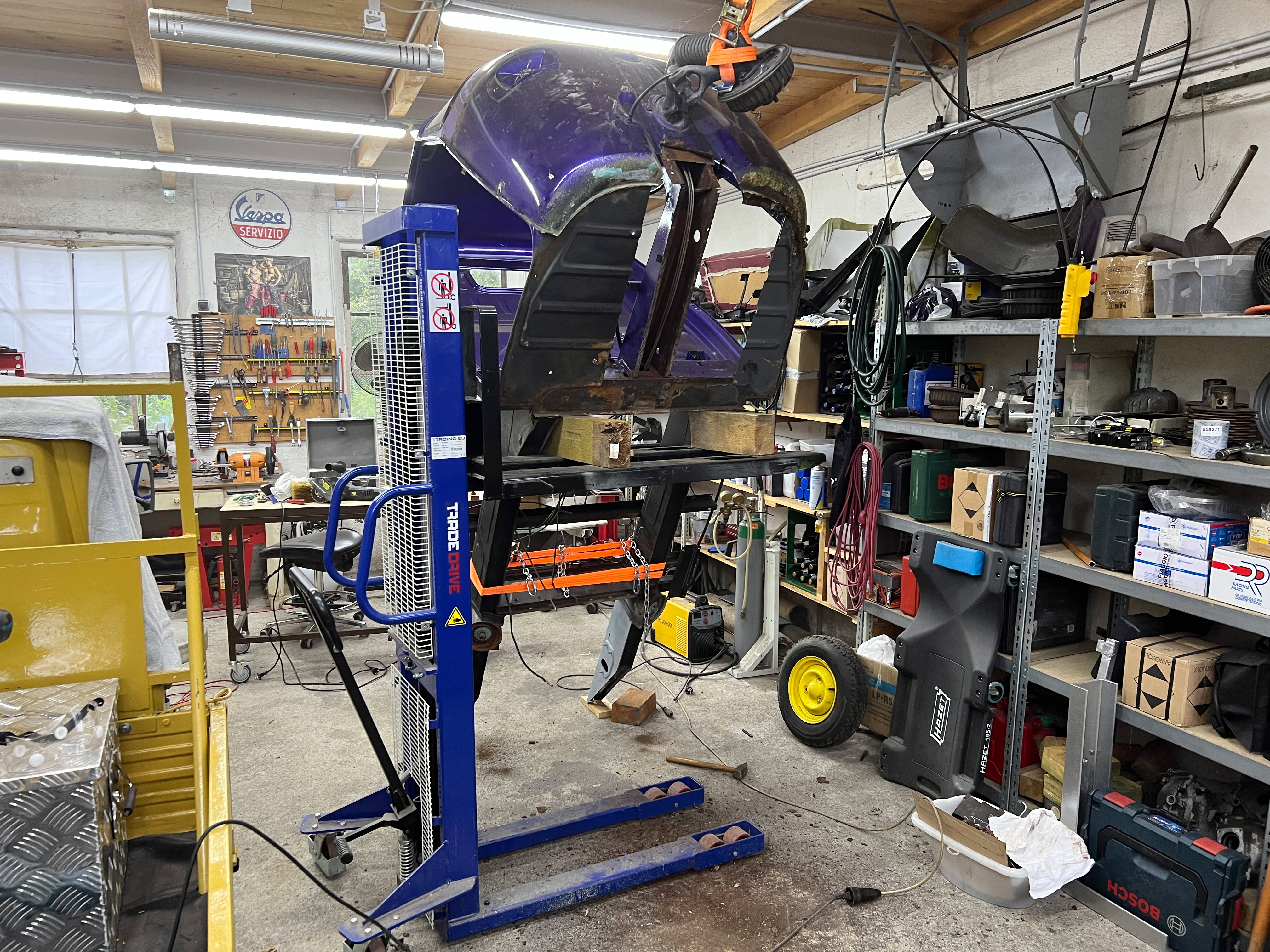 Ape 600 mpv, Baujahr 1972, ursprünglich als Eiswagen umgebaut. Jetzt ohne Pritsche und Motor erworben. Die Ape wurde zerlegt, geschweißt und neu aufgebaut. Ein gebrauchter Motor wurde komplett aufgearbeitet und eingebaut. Die Ape ist inzwischen taubenblau lackiert. Zur Zeit ist die Ladefläche in Arbeit. Es ist eine 2m-Pritsche einer Ape Classic. Deren Motorklappe wurde deshalb entsprechend versetzt und die Unterkonstruktion angepasst.