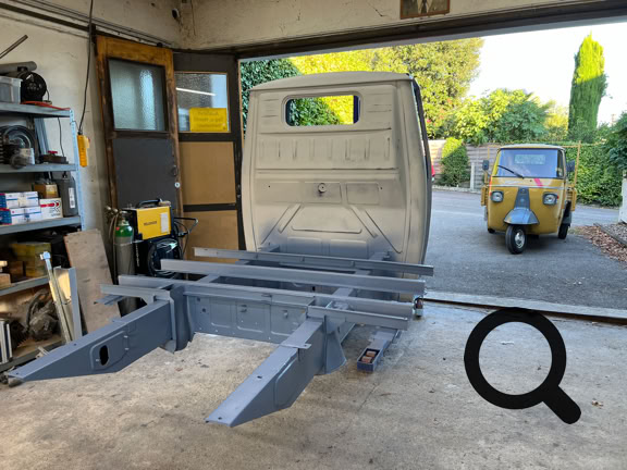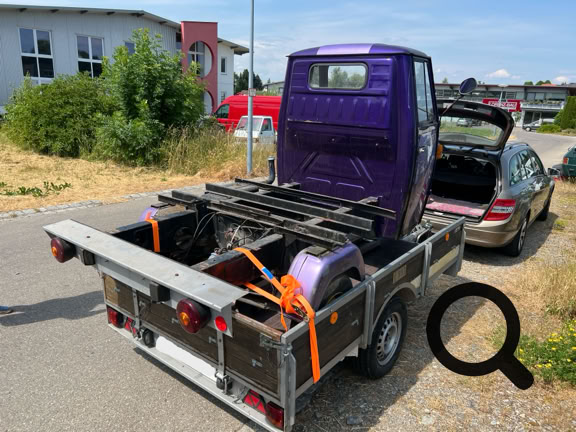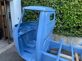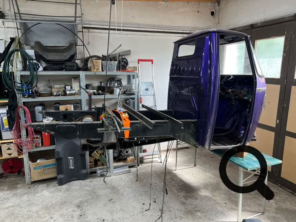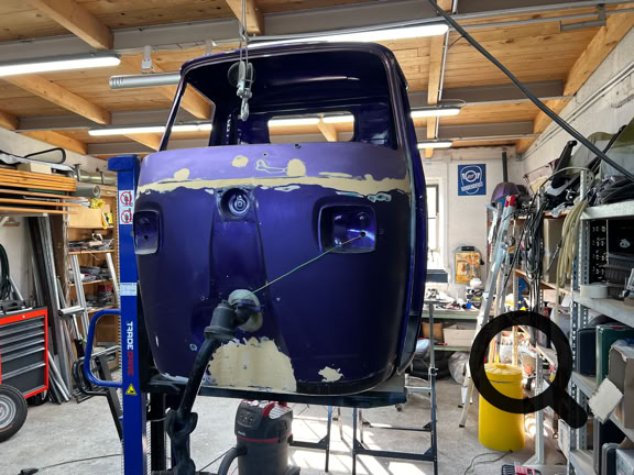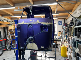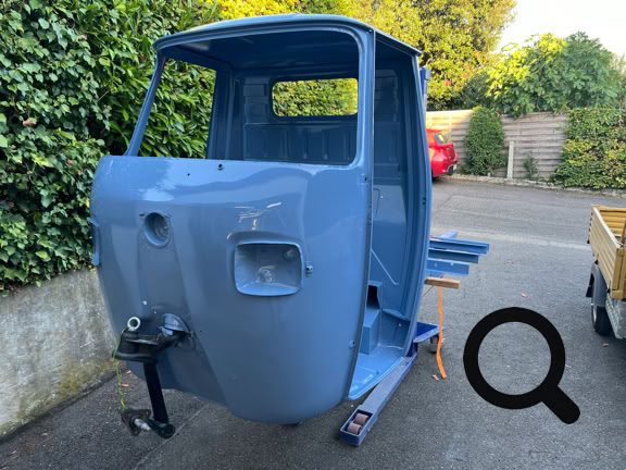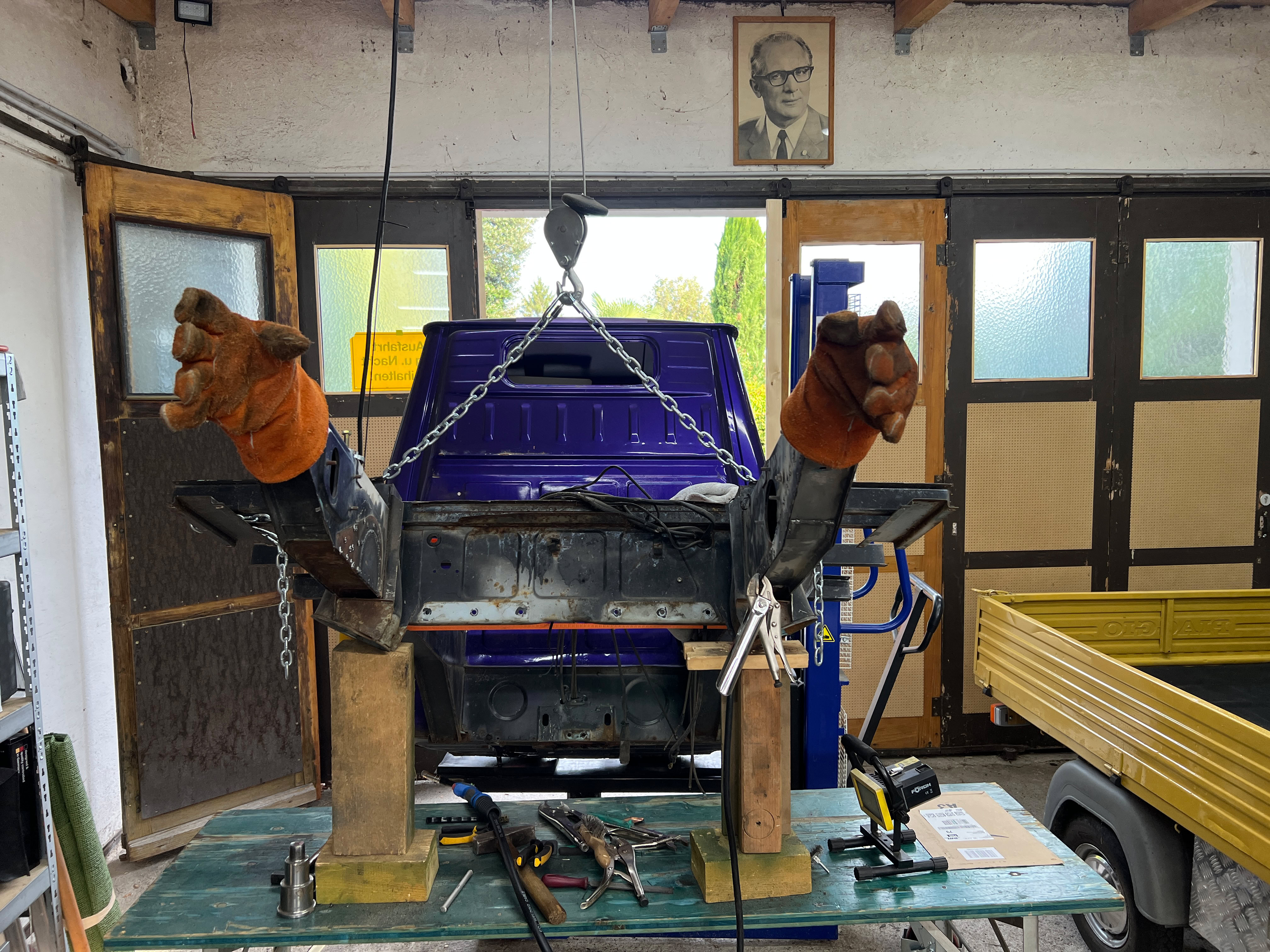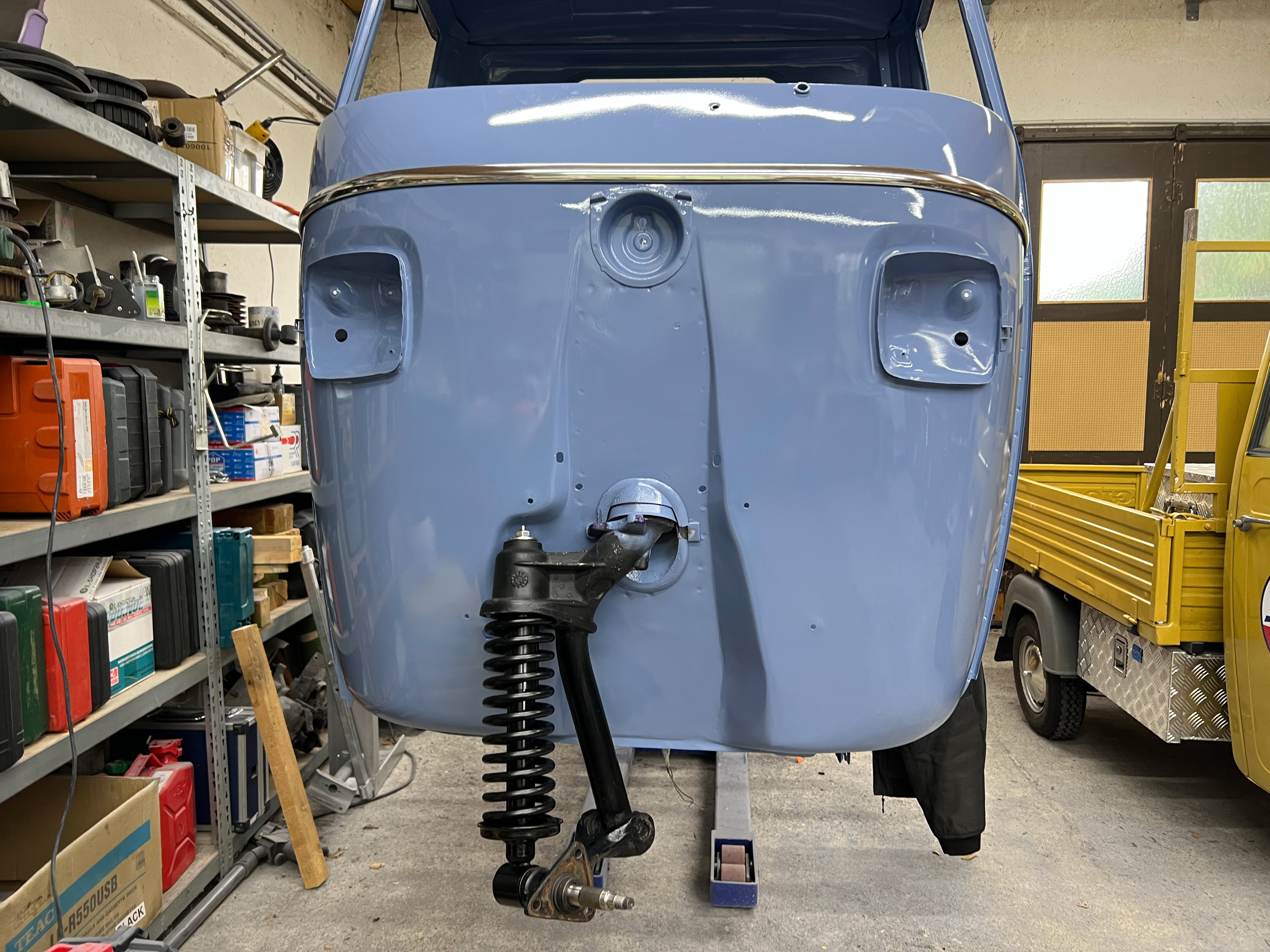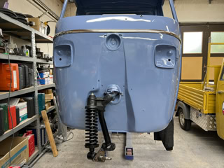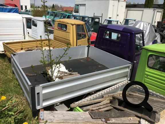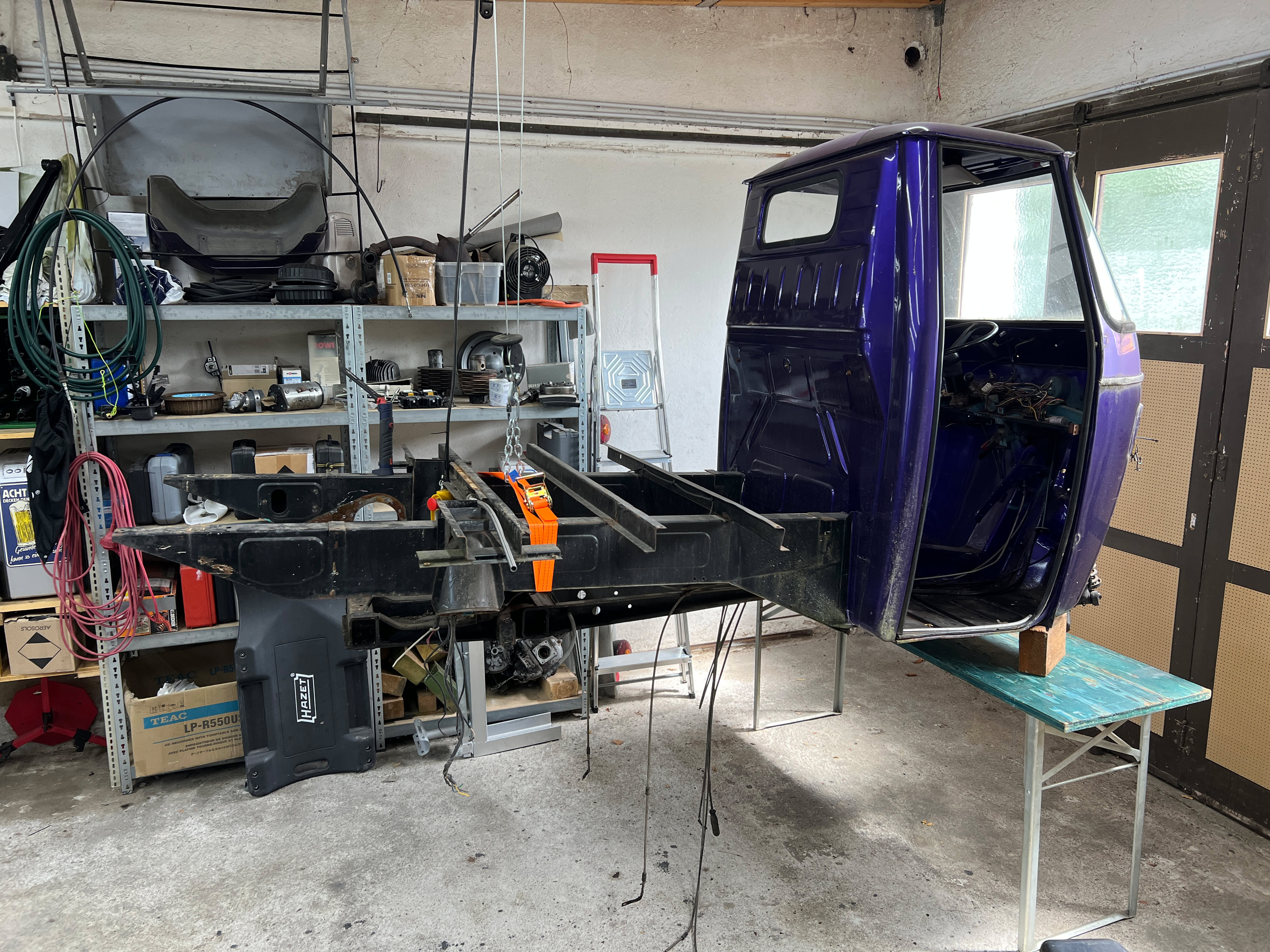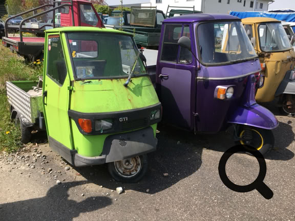 Ape 600 mpv, Baujahr 1972, ursprünglich als Eiswagen umgebaut. Jetzt ohne Pritsche und Motor erworben. Die Ape wurde zerlegt, geschweißt und neu aufgebaut. Ein gebrauchter Motor wurde komplett aufgearbeitet und eingebaut. Die Ape ist inzwischen taubenblau lackiert. Zur Zeit ist die Ladefläche in Arbeit. Es ist eine 2m-Pritsche einer Ape Classic. Deren Motorklappe wurde deshalb entsprechend versetzt und die Unterkonstruktion angepasst.
