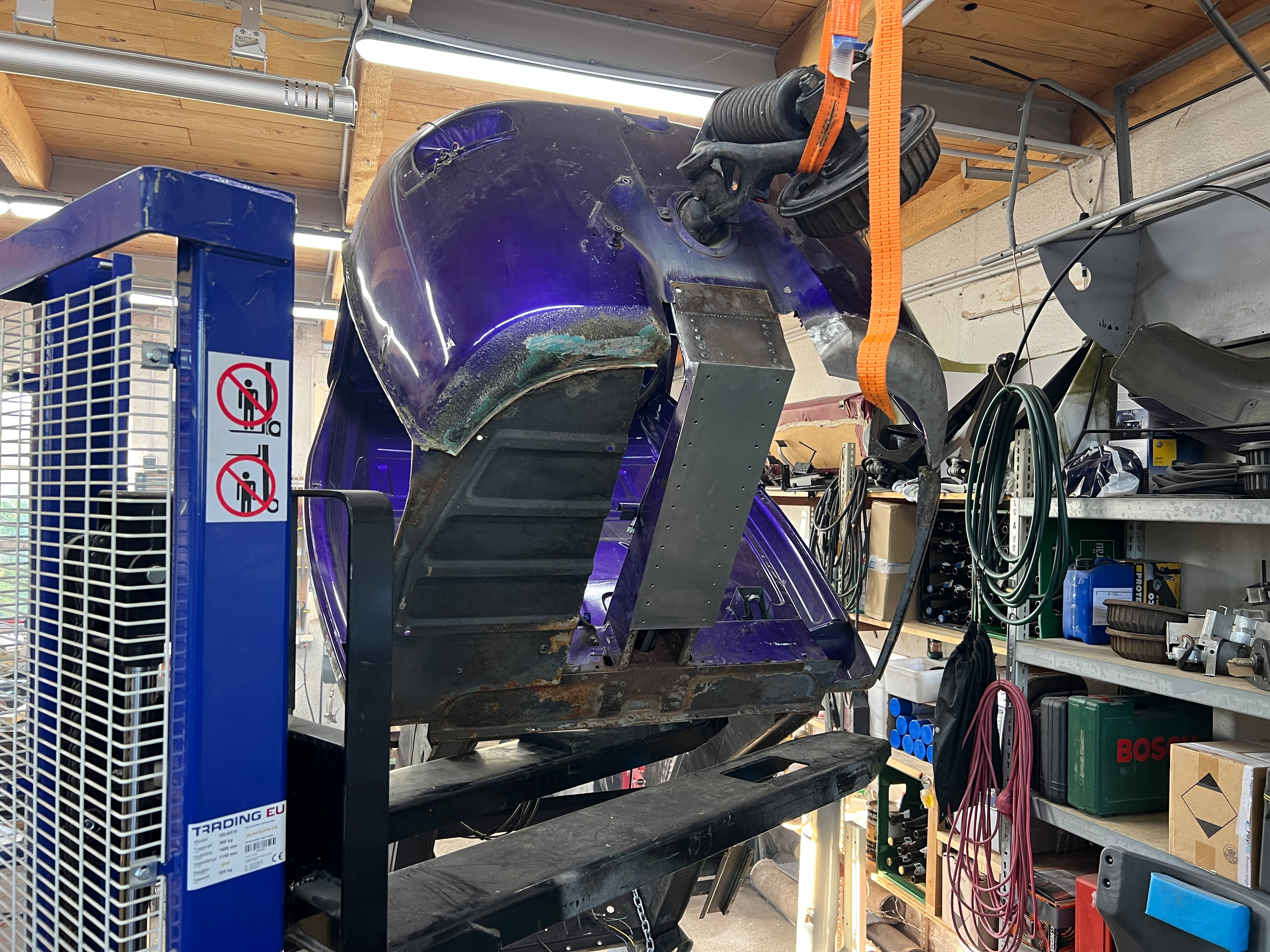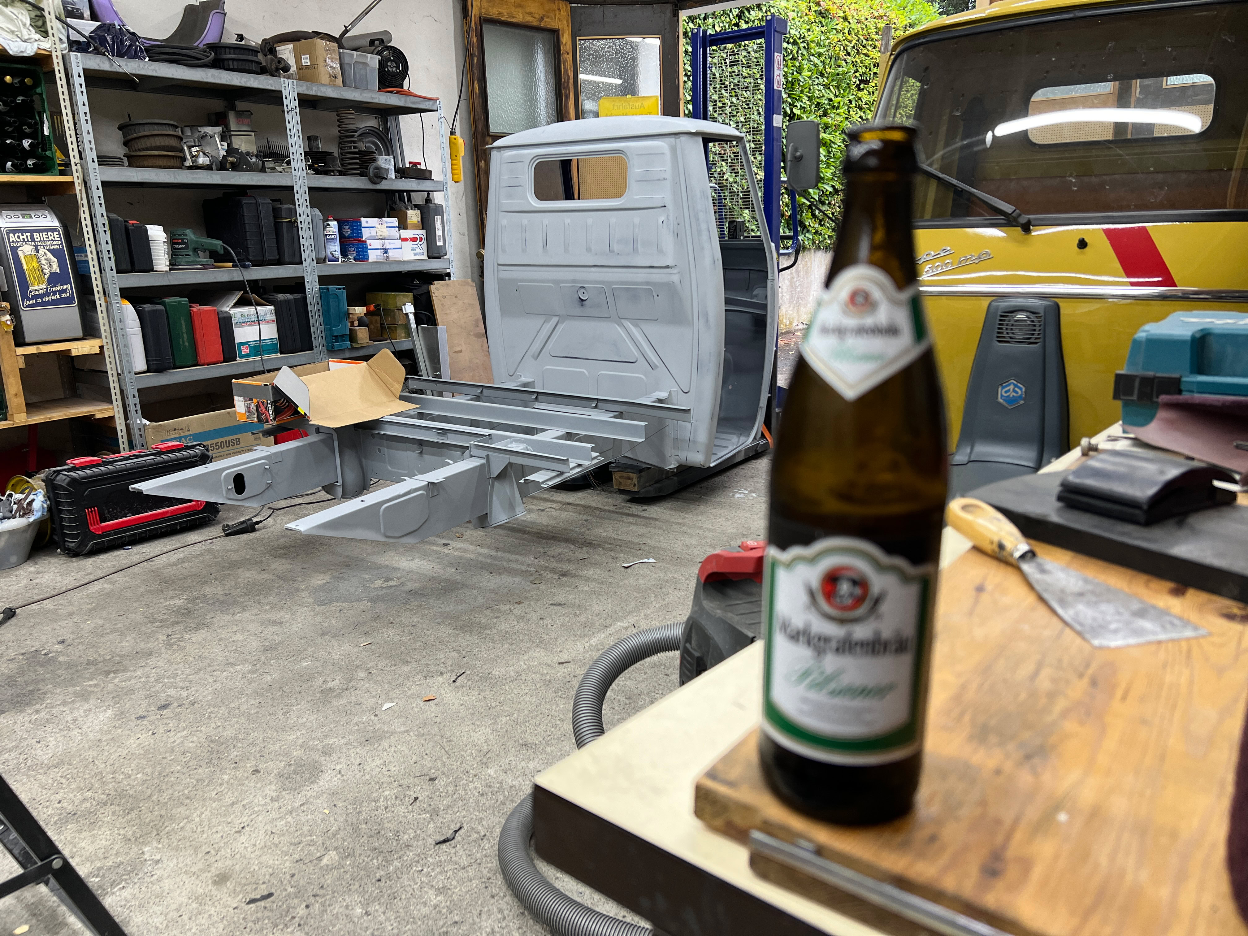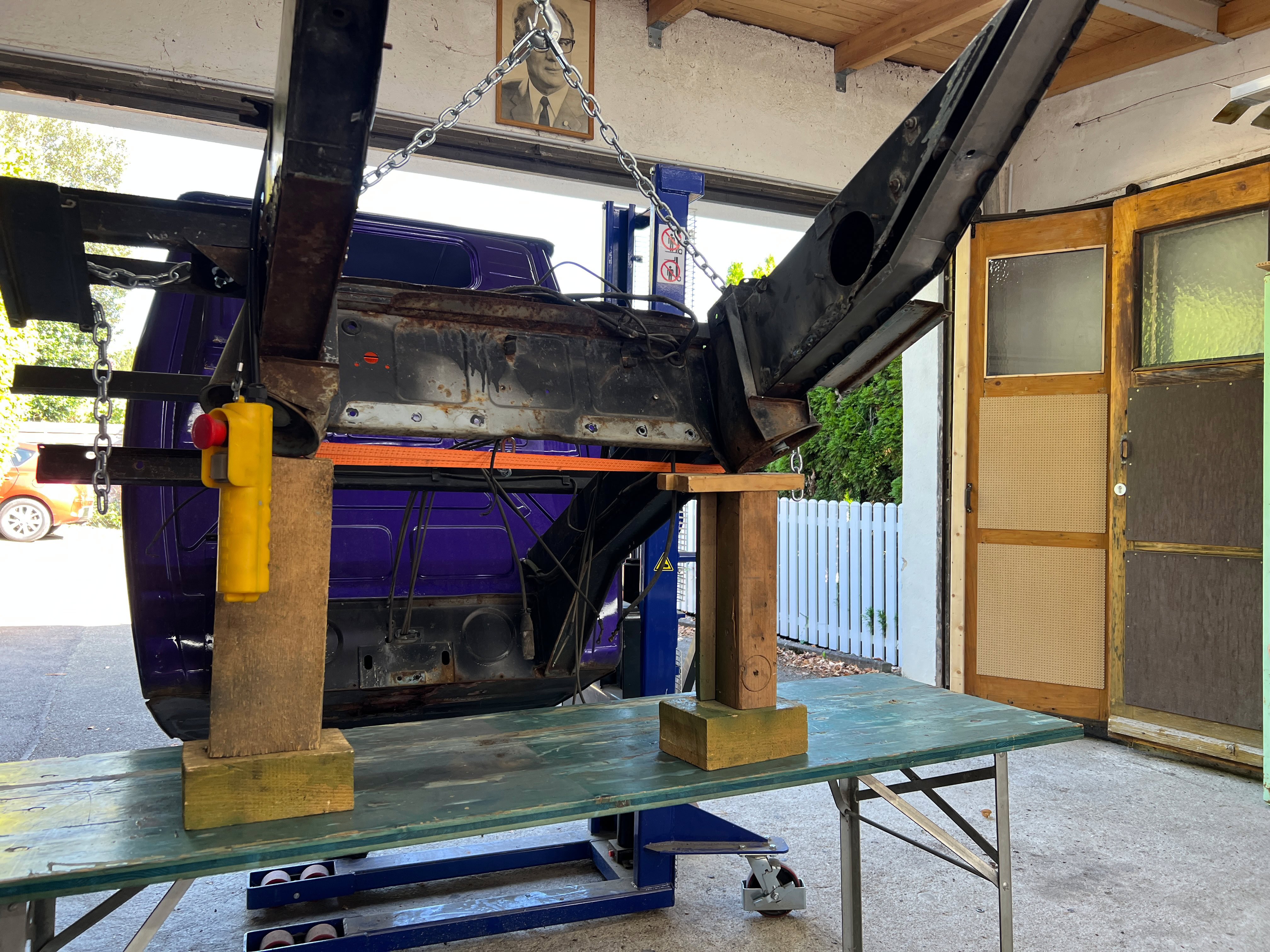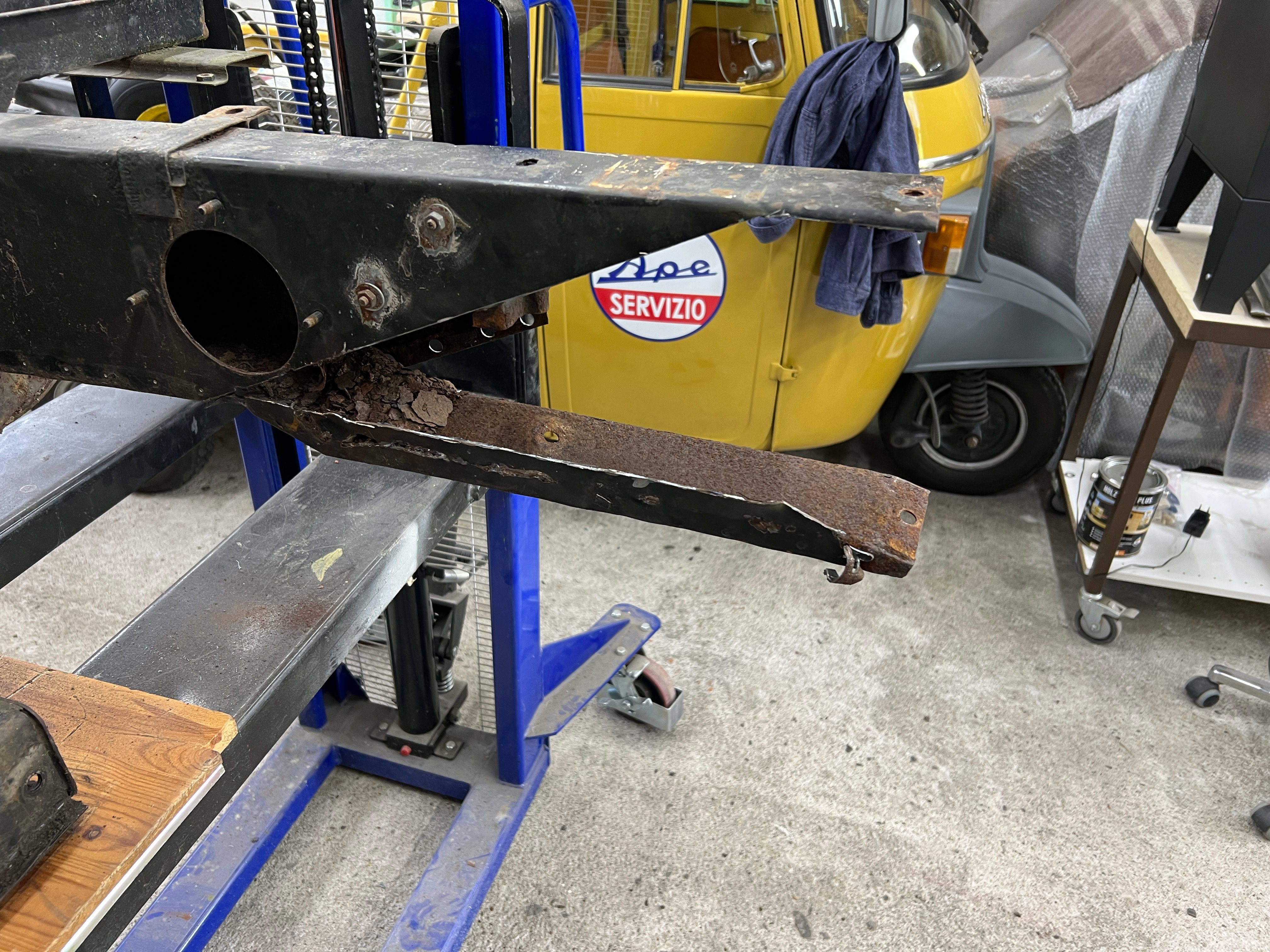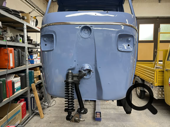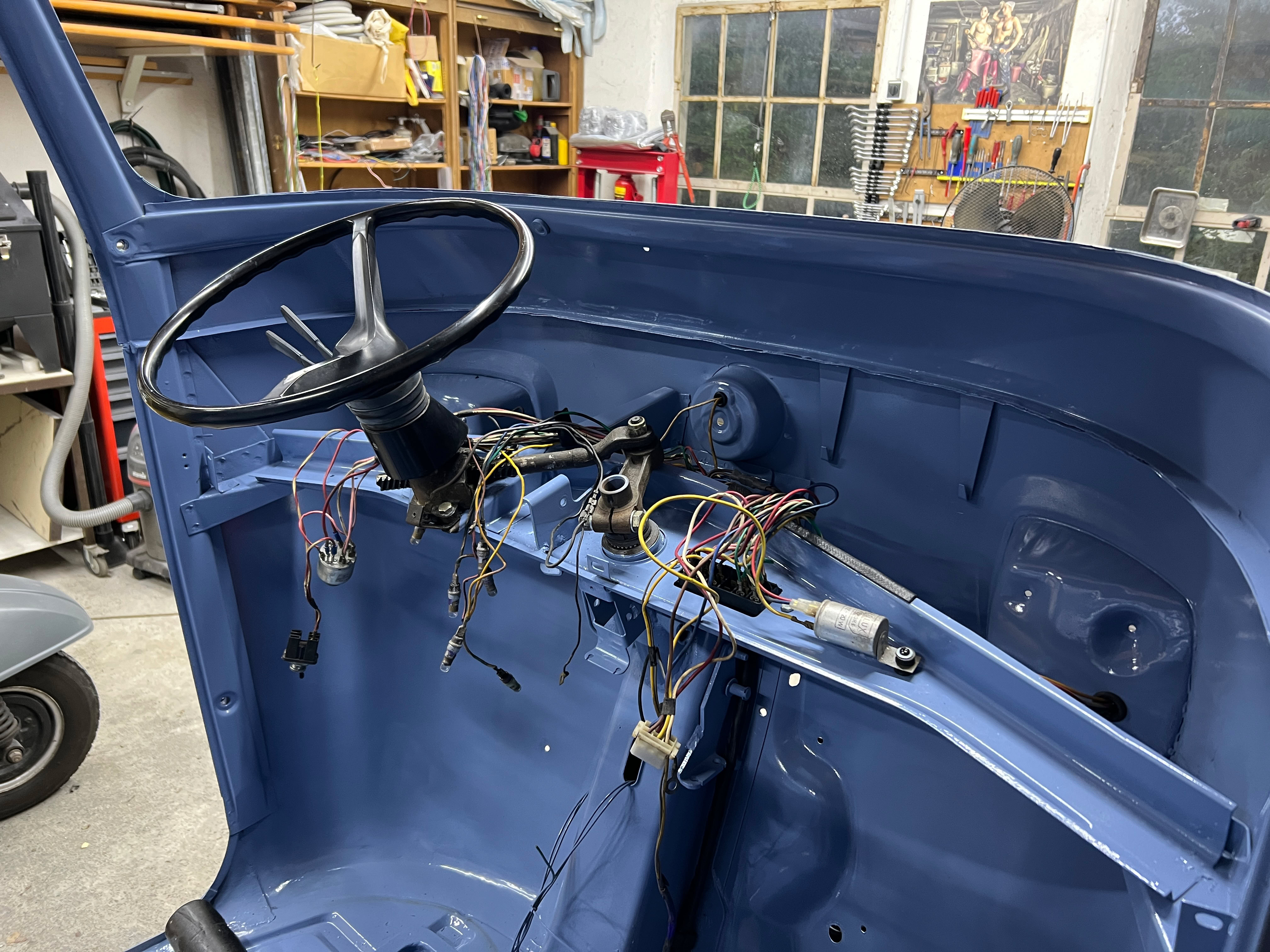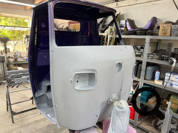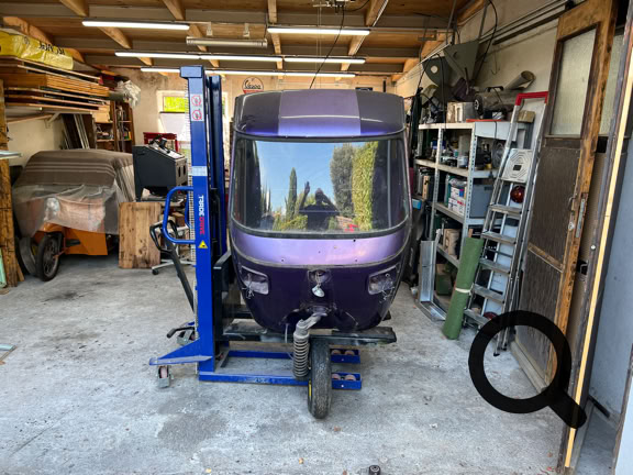 Ape 600 mpv, Baujahr 1972, ursprünglich als Eiswagen umgebaut. Jetzt ohne Pritsche und Motor erworben. Die Ape wurde zerlegt, geschweißt und neu aufgebaut. Ein gebrauchter Motor wurde komplett aufgearbeitet und eingebaut. Die Ape ist inzwischen taubenblau lackiert. Zur Zeit ist die Ladefläche in Arbeit. Es ist eine 2m-Pritsche einer Ape Classic. Deren Motorklappe wurde deshalb entsprechend versetzt und die Unterkonstruktion angepasst.