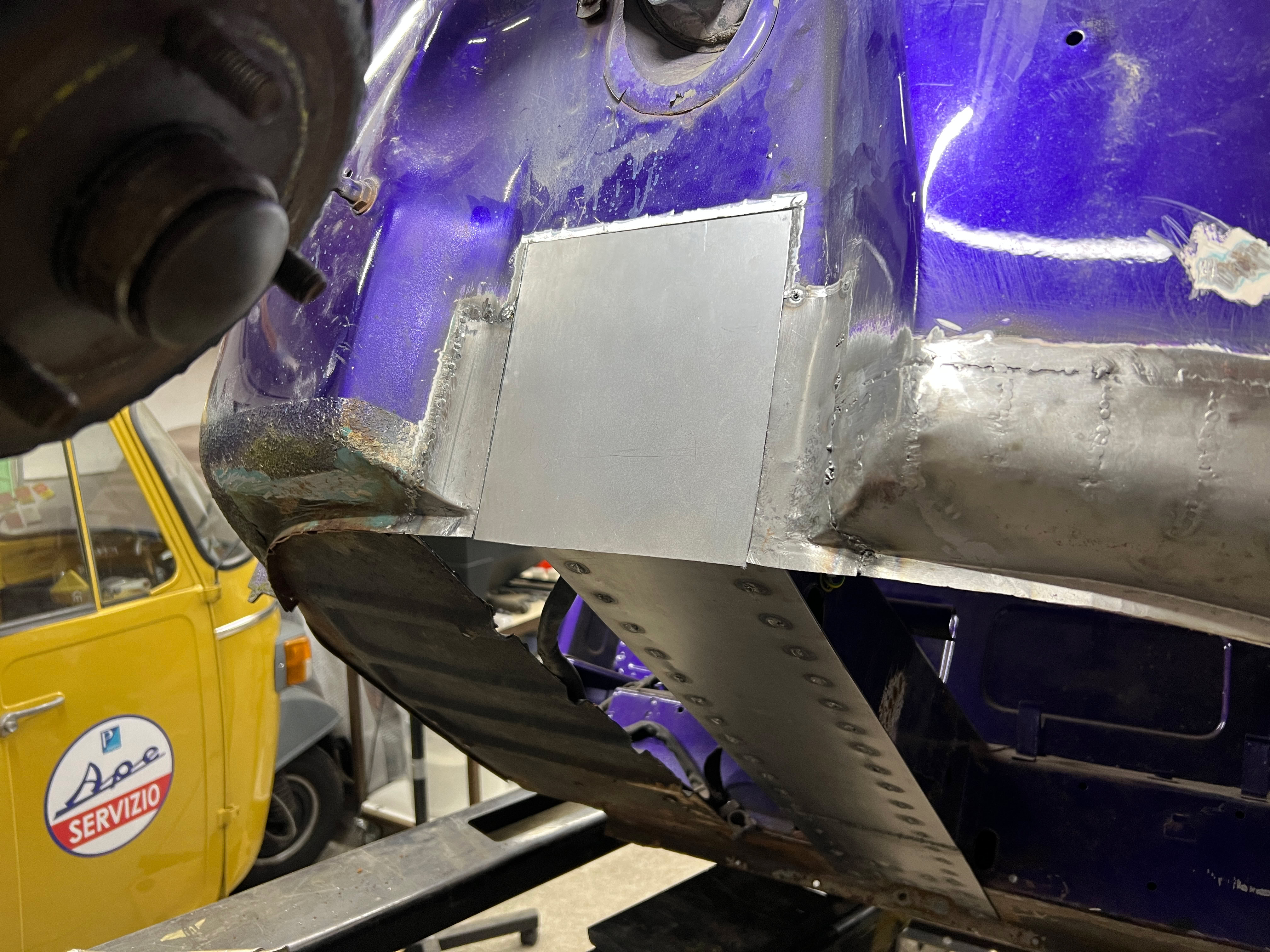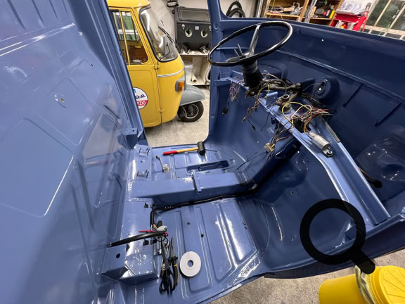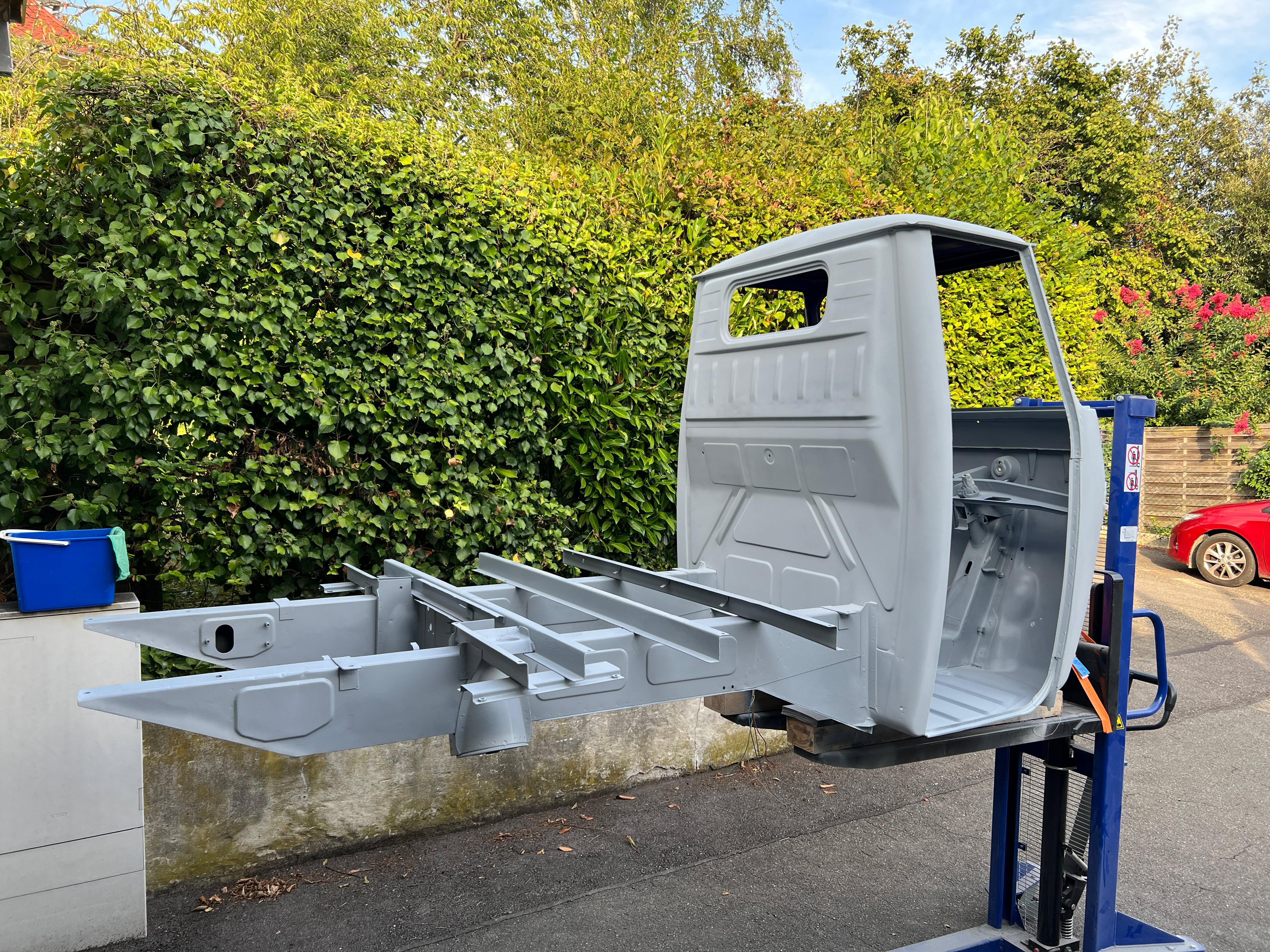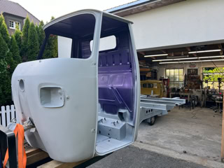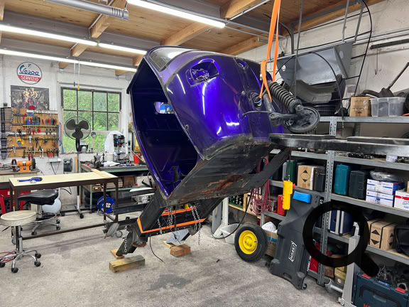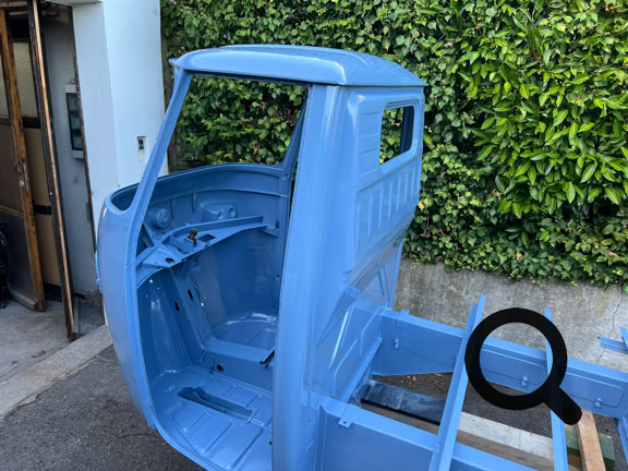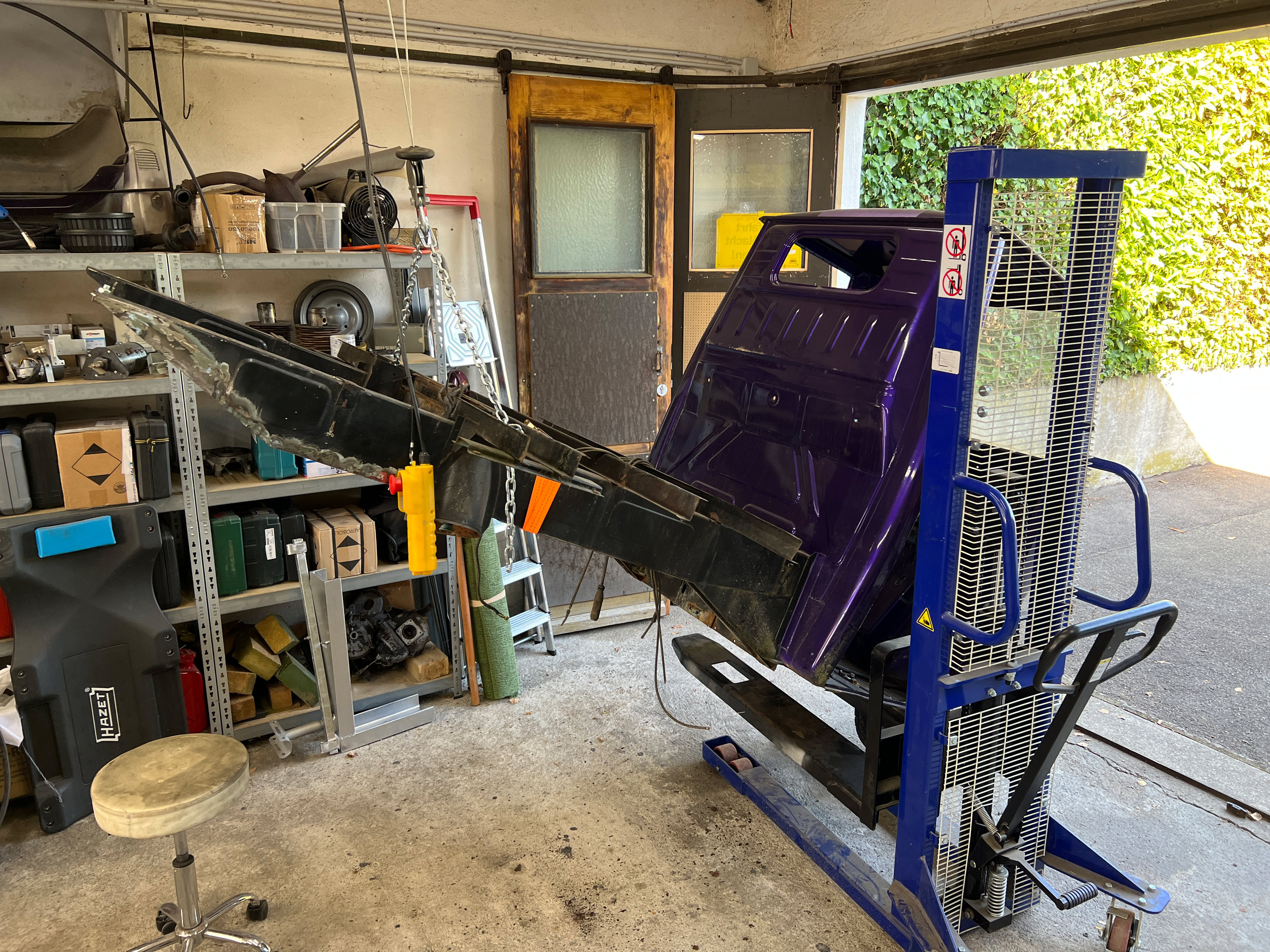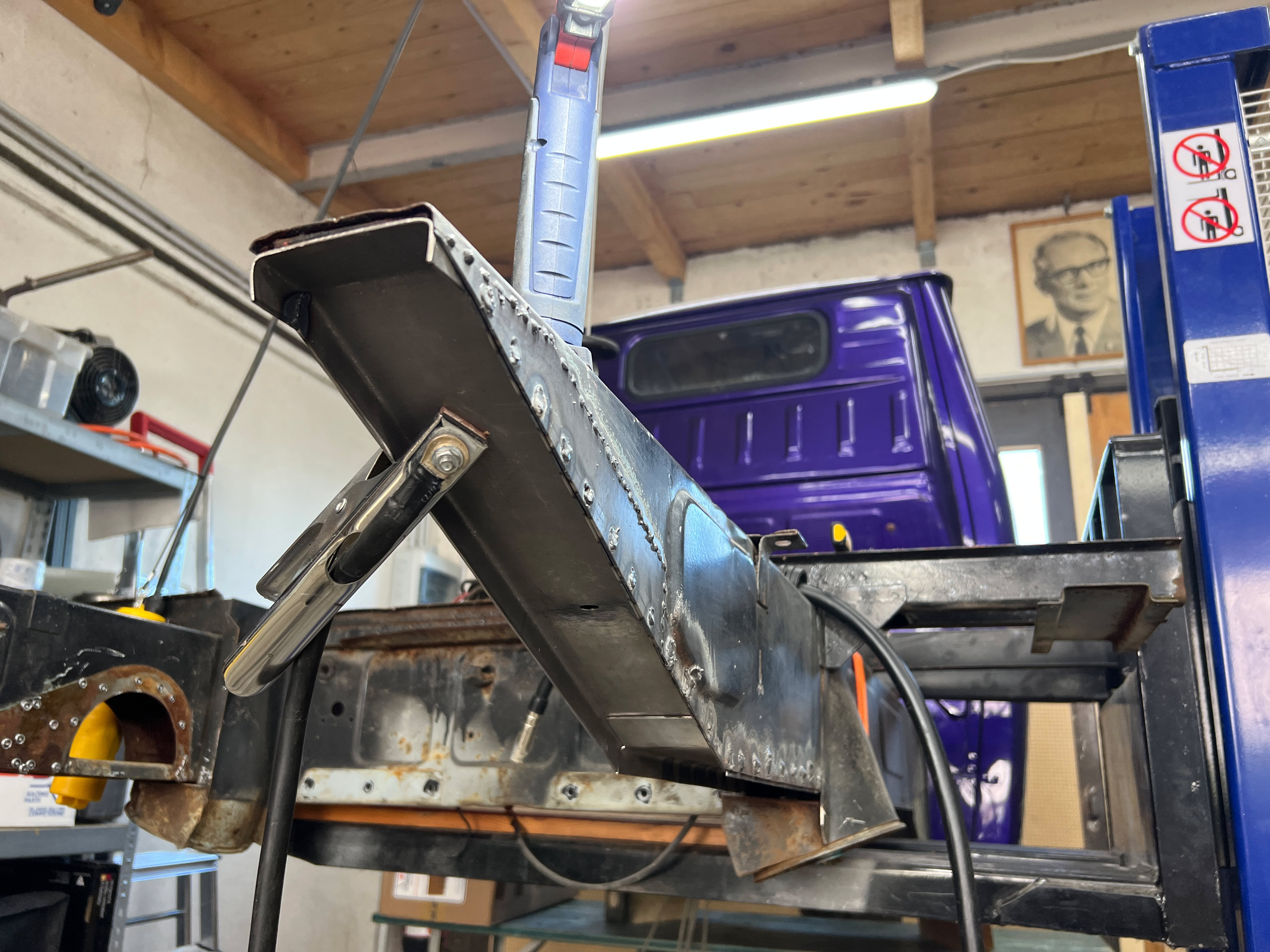 Ape 600 mpv, Baujahr 1972, ursprünglich als Eiswagen umgebaut. Jetzt ohne Pritsche und Motor erworben. Die Ape wurde zerlegt, geschweißt und neu aufgebaut. Ein gebrauchter Motor wurde komplett aufgearbeitet und eingebaut. Die Ape ist inzwischen taubenblau lackiert. Zur Zeit ist die Ladefläche in Arbeit. Es ist eine 2m-Pritsche einer Ape Classic. Deren Motorklappe wurde deshalb entsprechend versetzt und die Unterkonstruktion angepasst.